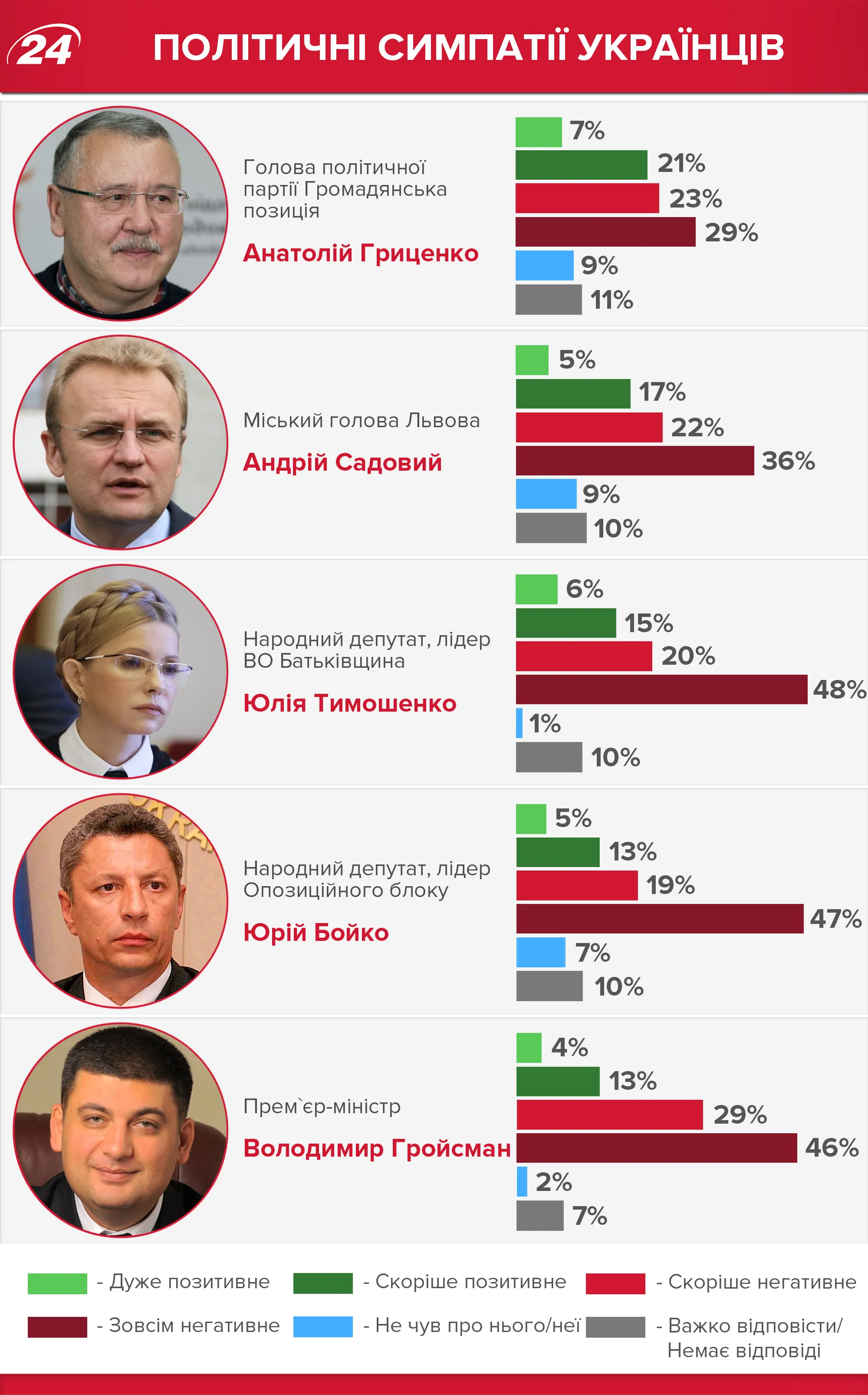 Так, 28% опитаних відповіли, що позитивно ставляться до лідера "Громадянської позиції" Анатолія Гриценка. 22% позитивно ставляться до мера Львова Андрія Садового. Далі в рейтингу симпатій розмістилися лідер "Батьківщини" Юлія Тимошенко (21%), лідер "Опозиційного блоку" Юрій Бойко (18%) та прем'єр-міністр України Володимир Гройсман (17%).