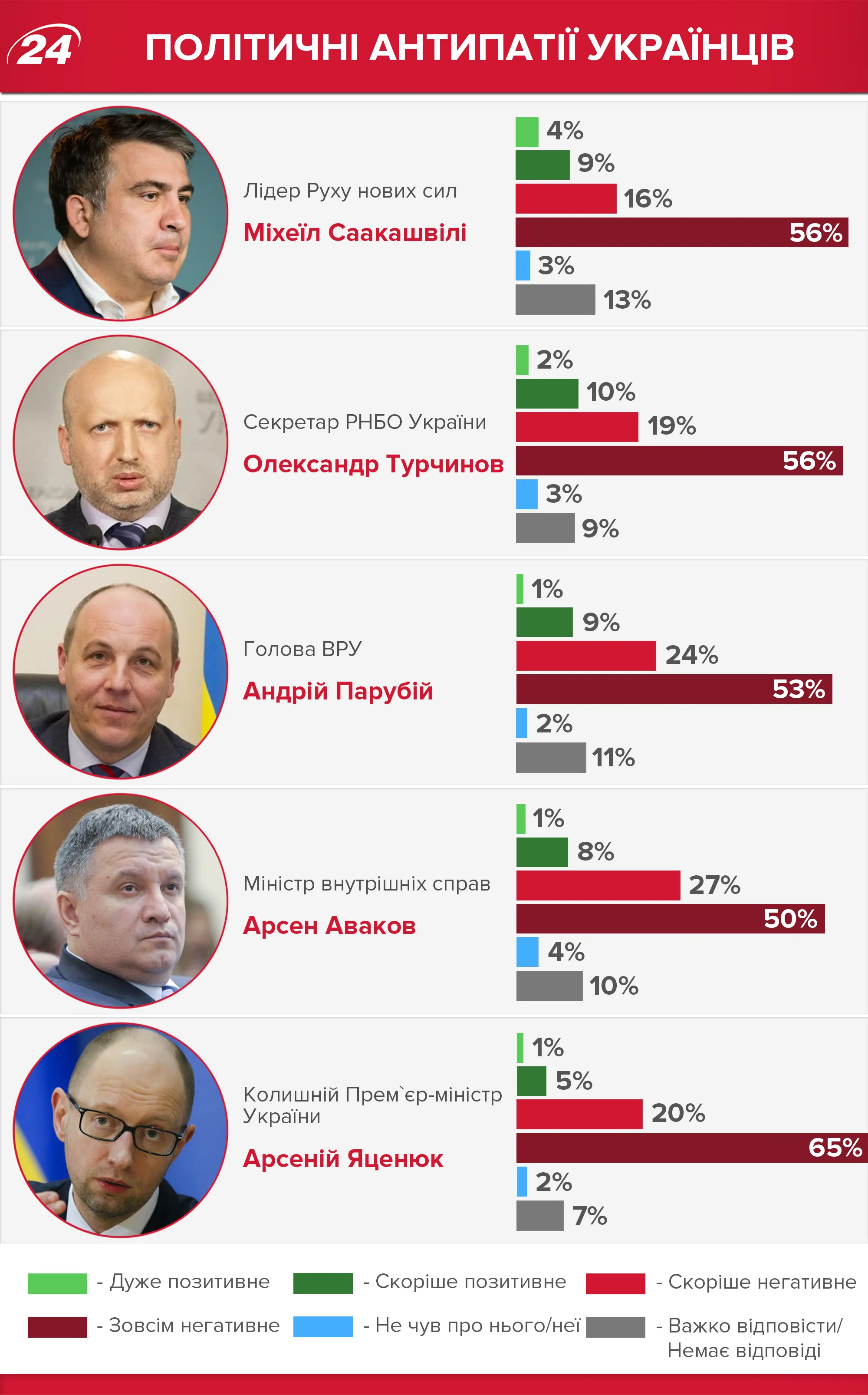 В кінці рейтингу – політики, які завоювали найменшу прихильність українців. Серед них – лідер "Руху нових сил" Міхеїл Саакашвілі (13%), секретар РНБО Олександр Турчинов (12%), голова Верховної Ради Андрій Парубій (10%), міністр внутрішніх справ Арсен Аваков (9%) та лідер "Народного фронту" Арсеній Яценюк (6%).