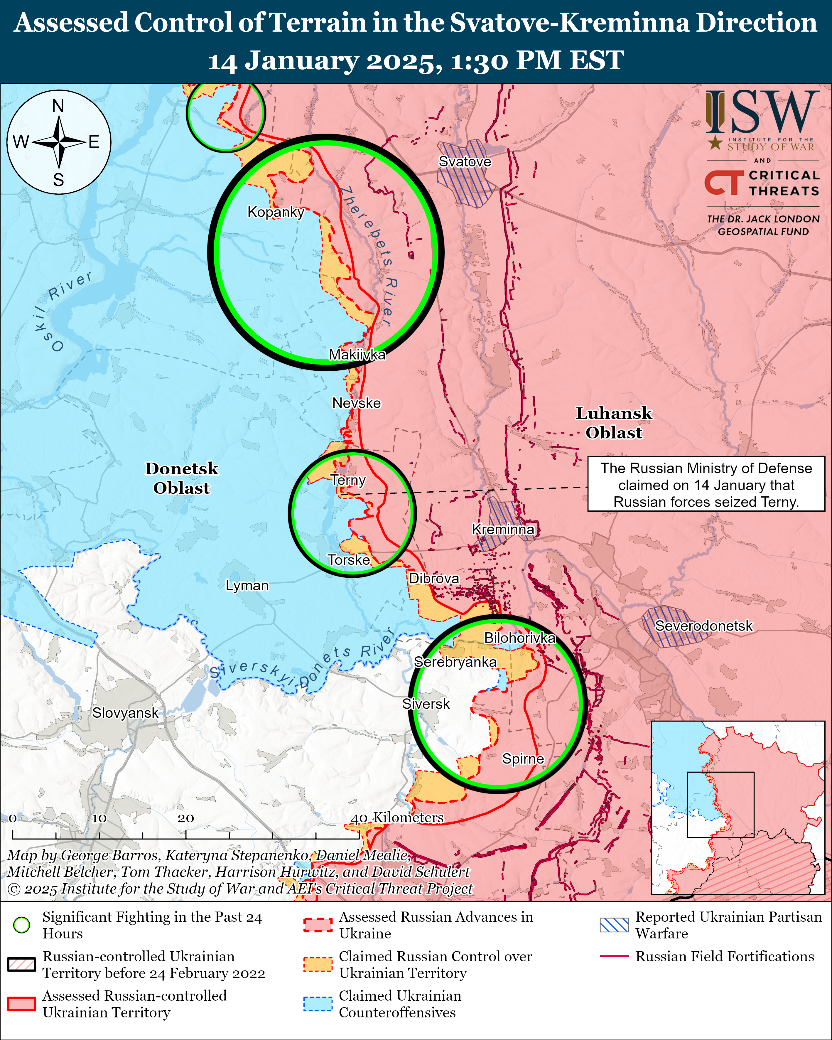 - Російські війська 13 і 14 січня продовжували наступати в районі Сіверська – біля Білогорівки, Григорівки, Верхньокам'янського, Івано-Дар'ївки та Виїмки, але не просунулися вперед. Те саме стосується і Часового Яру.