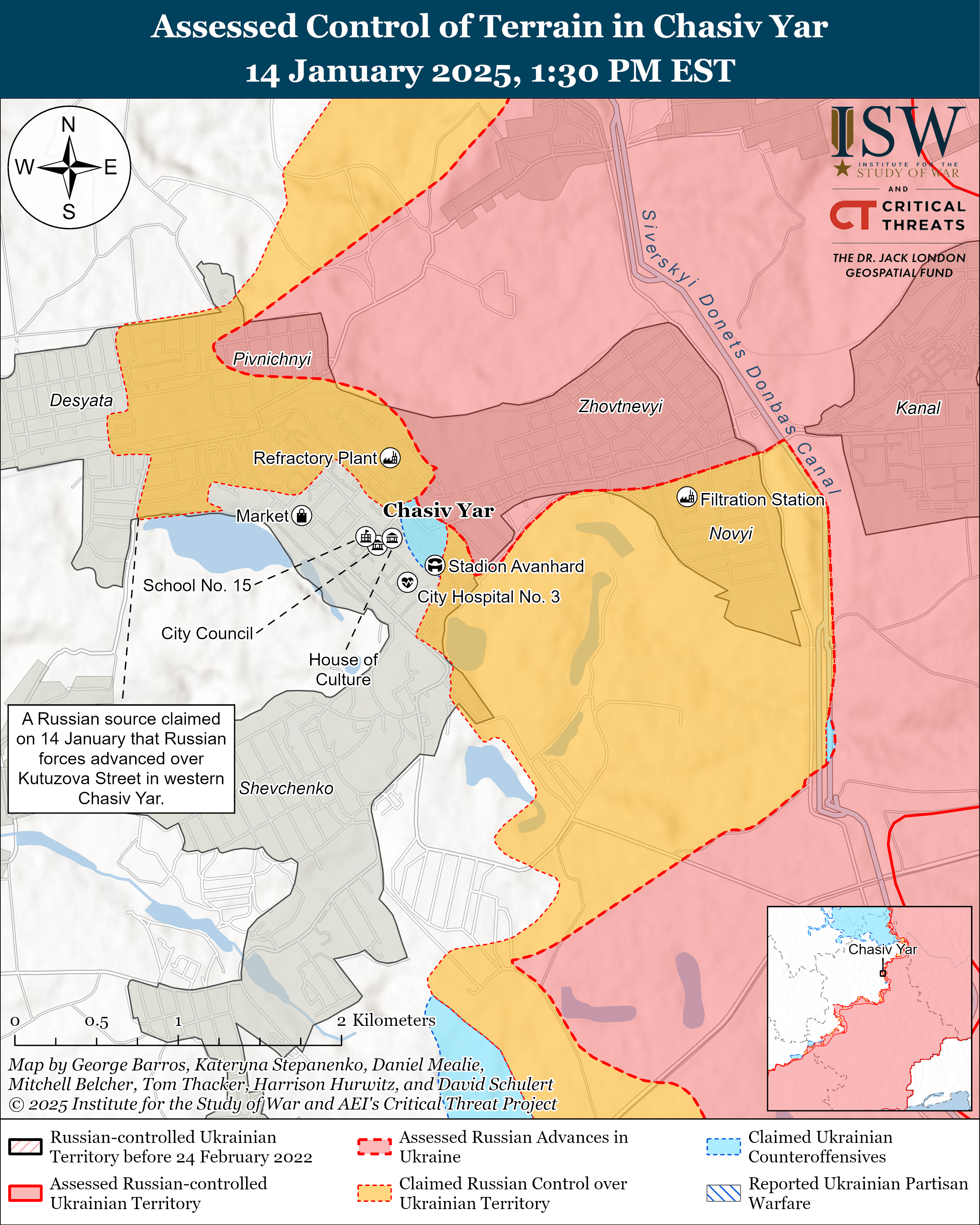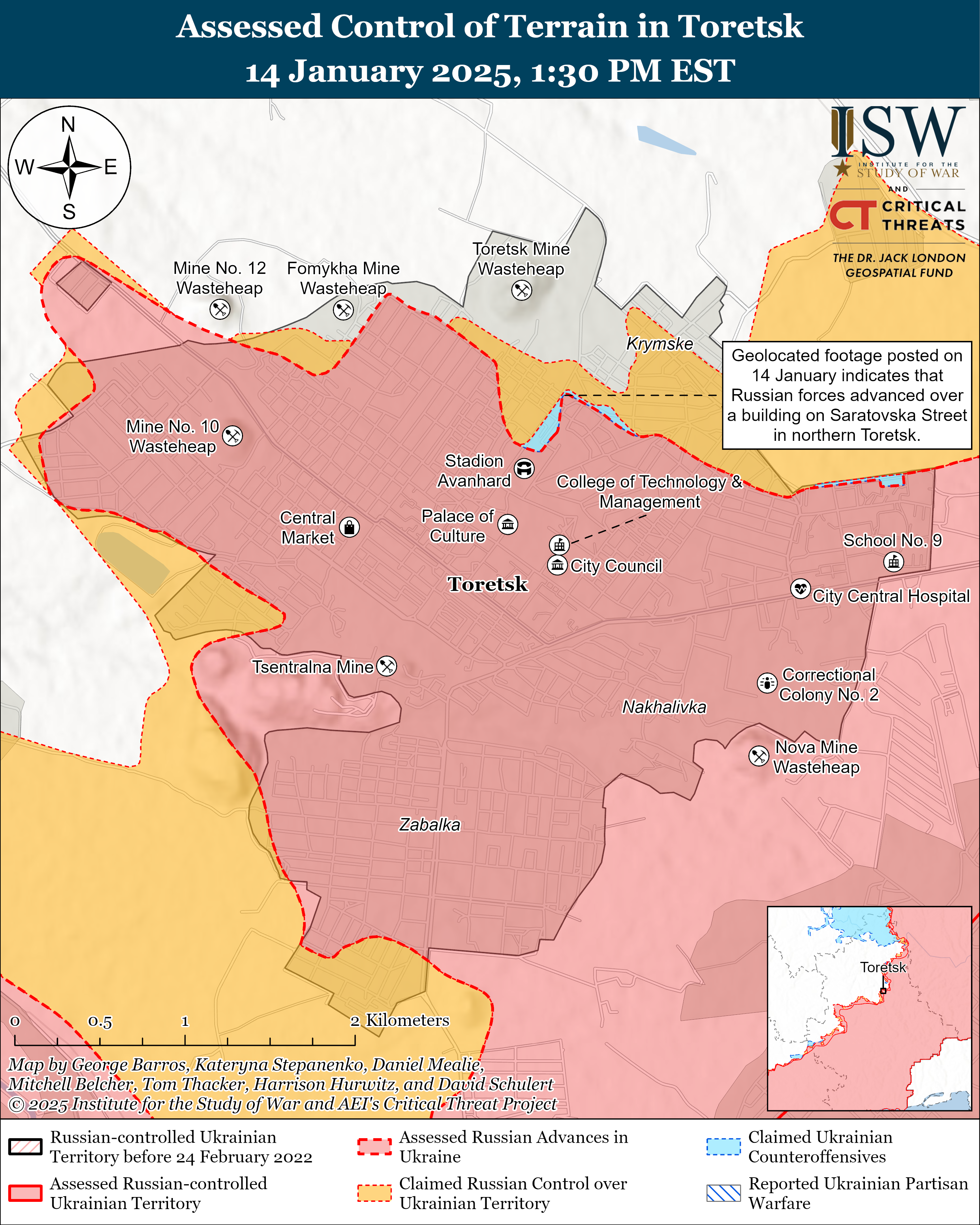 - А проте російські сили незначно просунулися в Торецьку. Геолокаційні кадри, опубліковані 14 січня, показують, що це сталося в північній частині міста. Росіяни також стверджували, що просунулися на північно-західну околицю Торецька, але ISW не знайшов підтвердження цієї заяви.
