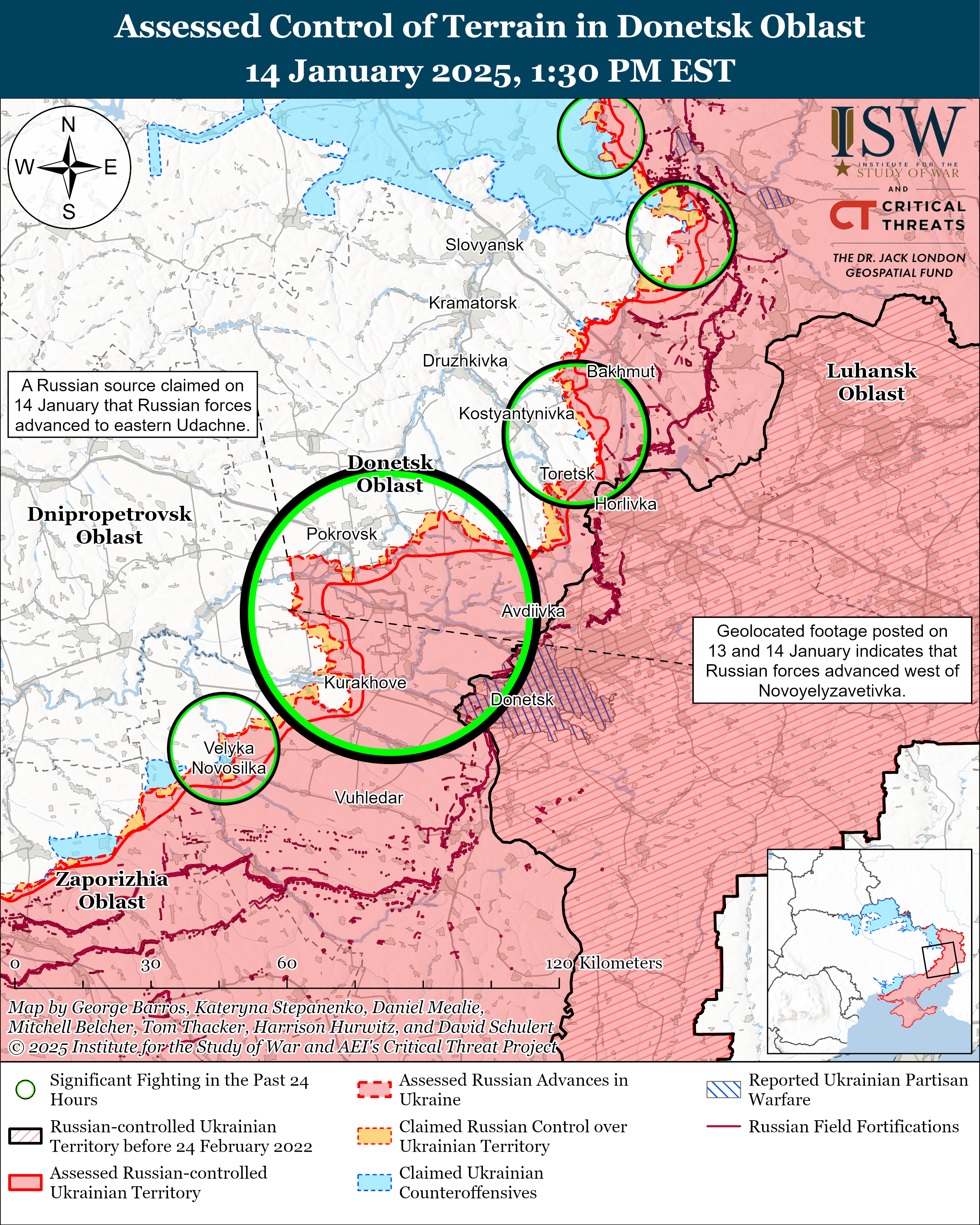 - Російські війська 14 січня продовжували наступальні операції в Курській області, але не підтвердили просувань. Українські контратаки уповільнюють темп просування армії Росії.