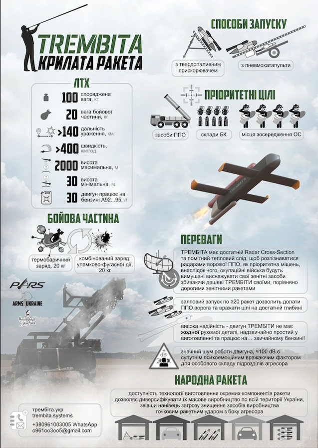 Ще одна перевага "Трембіти" – вона проста, її можна збирати буквально в гаражах і невеличких бункерах у повній децентралізації. Також "Трембіті" не потрібні жодні надскладні, надмасивні та дорогі платформи – вона стартує з простенької рамки чи пневмокатапульти, тому в теорії її можуть навіть запускати оператори ССО в російському тилу.