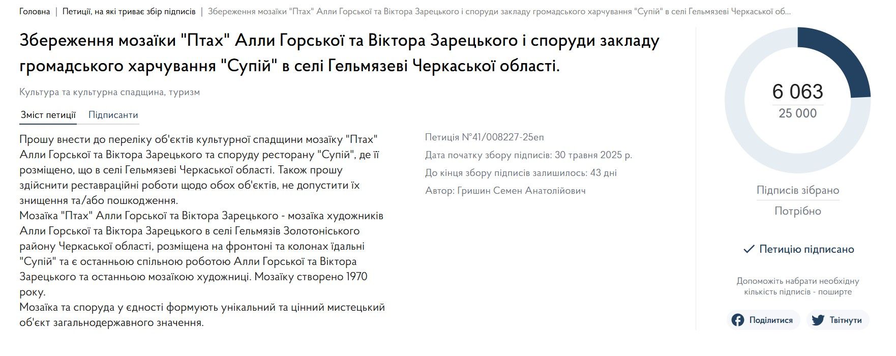 Однак будівля колишньої їдальні не має жодного охоронного статусу, що фактично ставить під загрозу існування цієї пам'ятки. Тому за ініціативи Семена Гришина з'явилася петиція до Уряду з вимогою внести будівлю "Супій" та мозаїку "Птах" до переліку культурної спадщини, що допоможе зберегти роботу Горської і Зарецького. З необхідних 25 000 підписів зараз є лише понад 6 000. Кожен підпис може допомогти зберегти останню роботу видатної дисидентки та одну з останніх, які залишилися цілими.