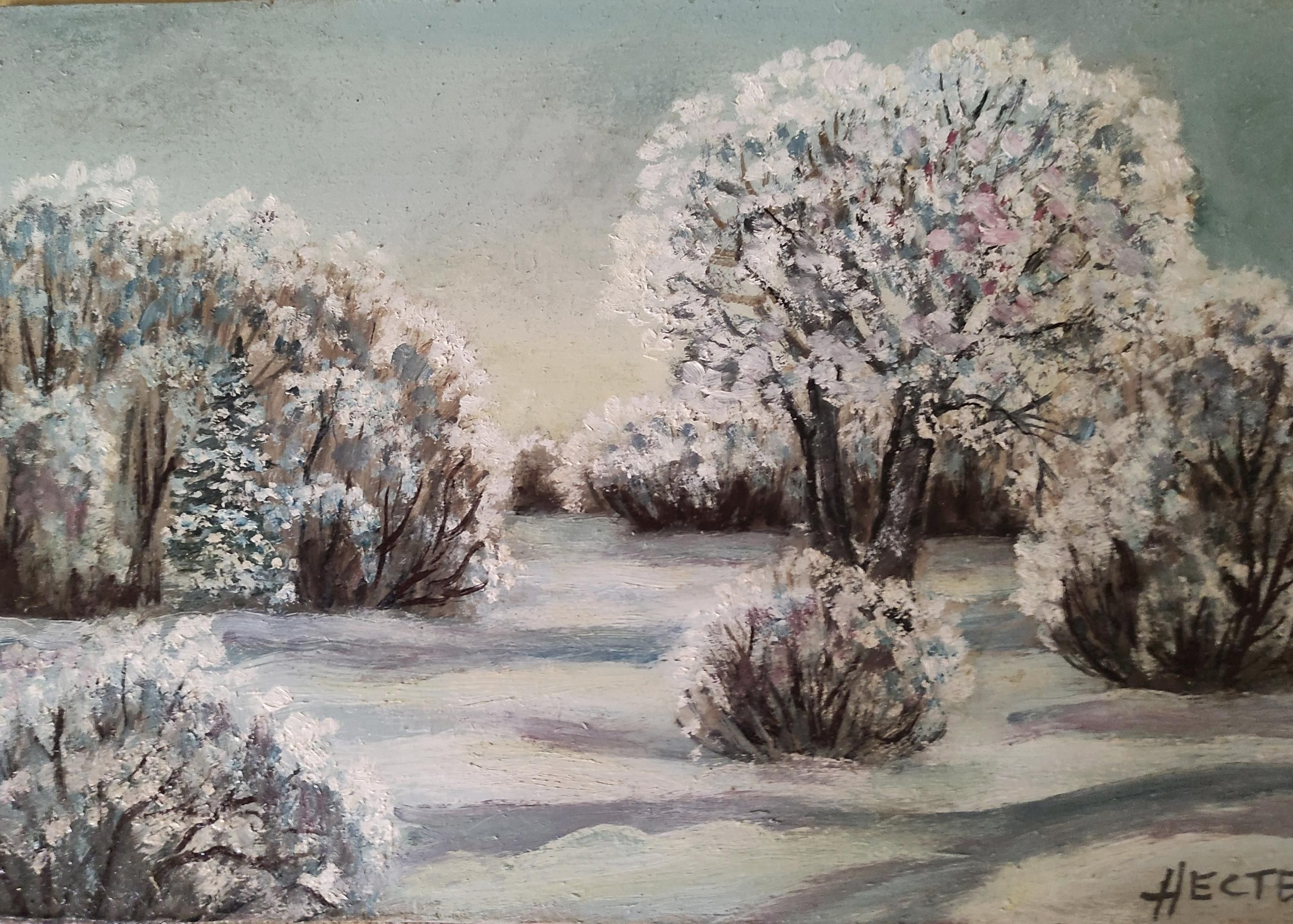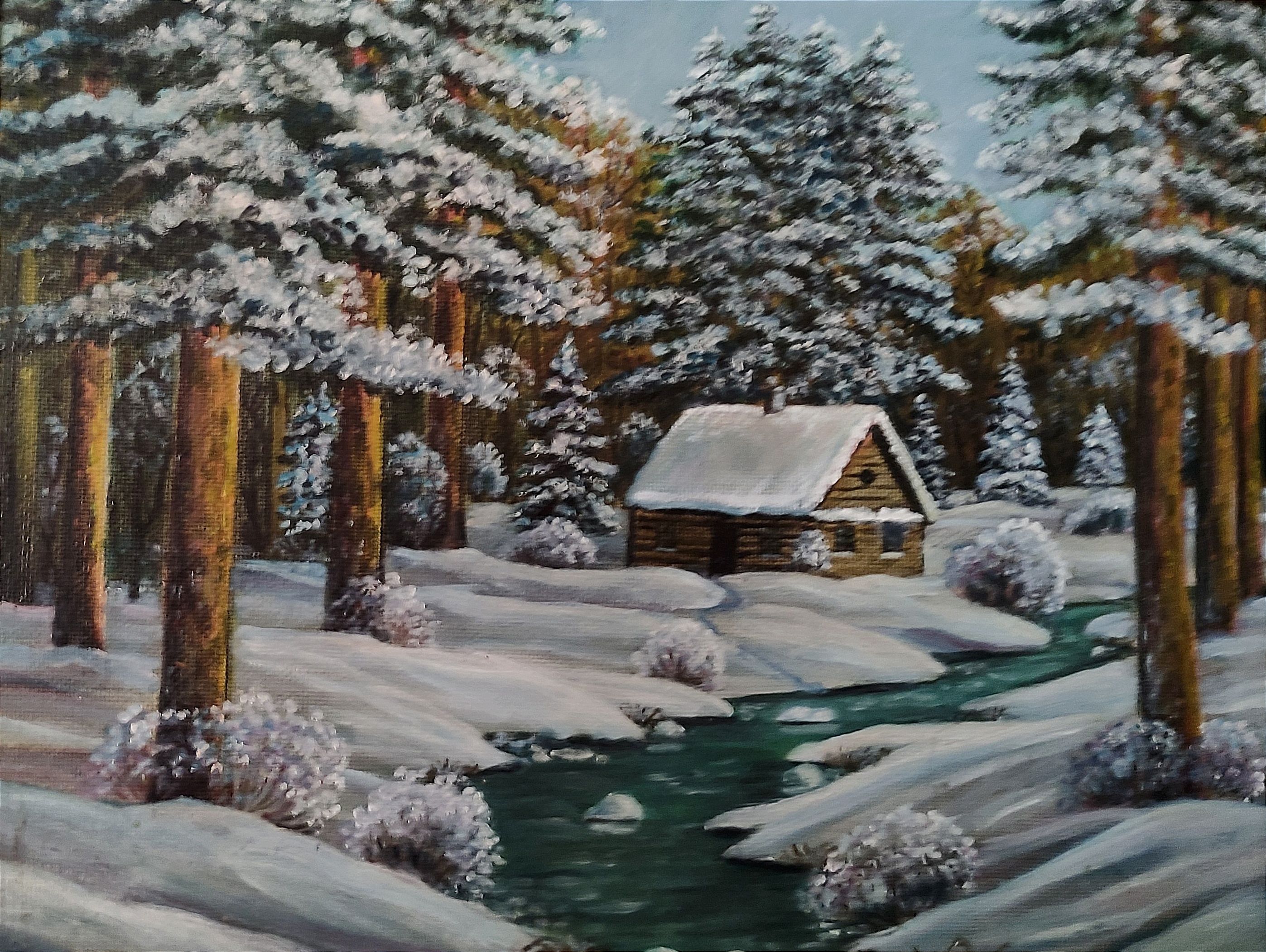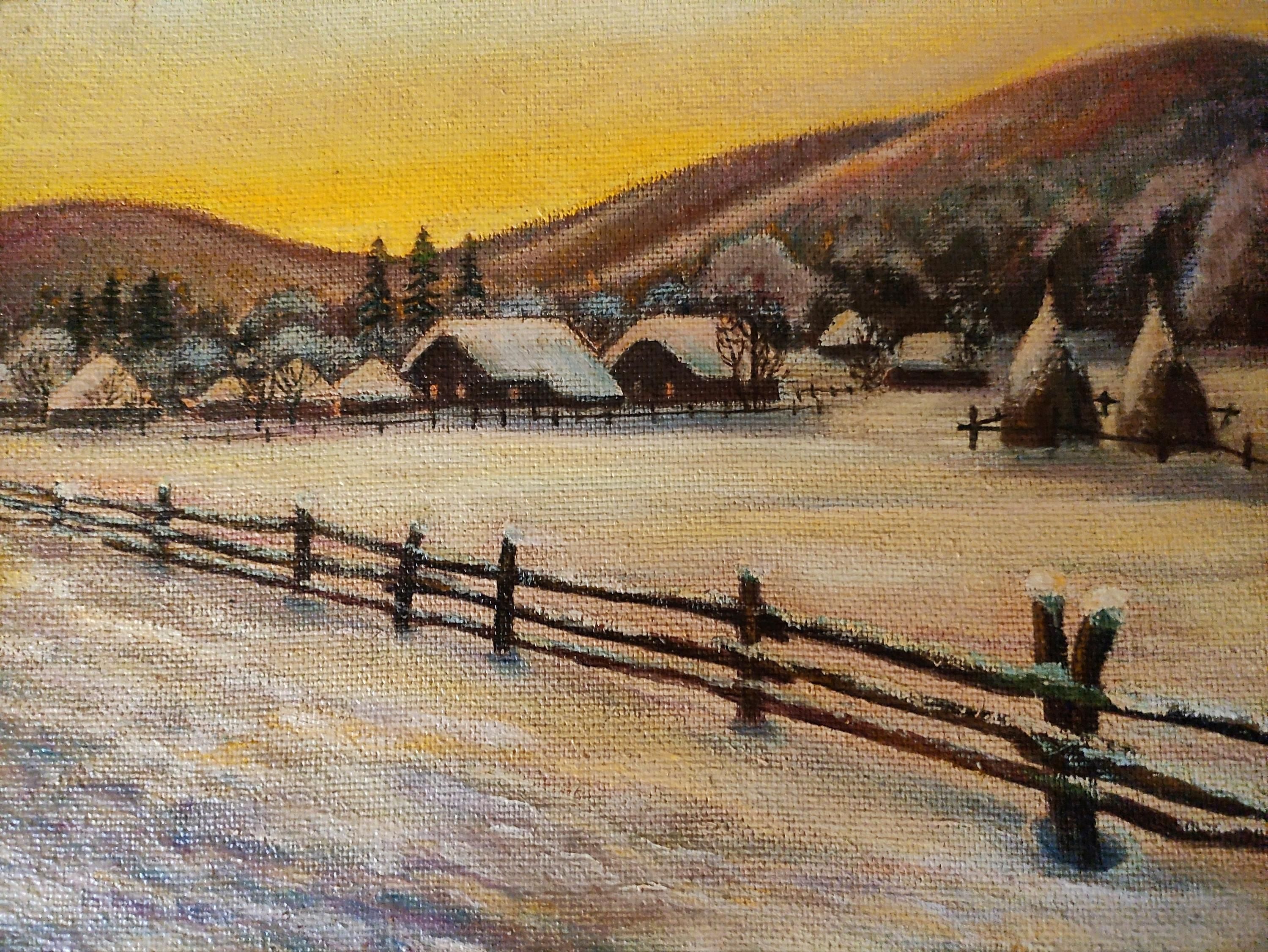 Він додає, що також багато допомагає уява: "От це село українське і зимовий пейзаж я намалював повністю зі своєї уяви. Придумав собі такий ліс, річечку, одиноку хатину, присипану снігом, і відтворив це у своїй картині."