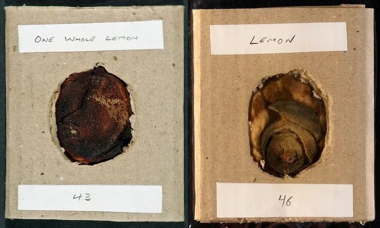 Ліворуч – знайдений у кишені Мюллера лимон, а праворуч – шматочки лимонів, знайдені у шухляді / Фото National Archives