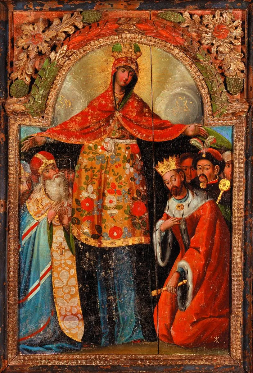 "Покрова Богородиці" із зображенням Богдана Хмельницького й архієпископа Лазаря Барановича, перша половина XVIII століття. Походить із Покровської церкви села Дешки, тепер Богуславського району Київської областi / Фото з фондів Національного художнього музею України