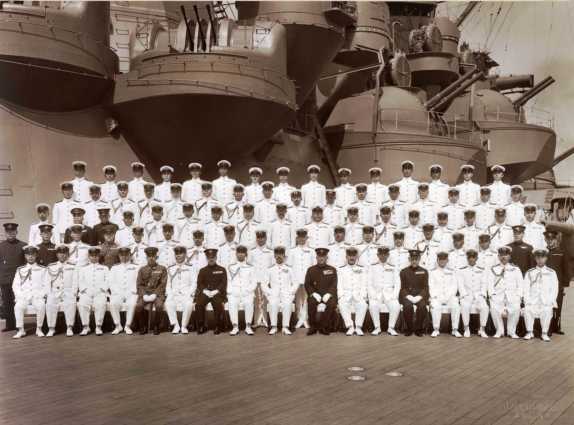 Імператор Хірохіто (центр нижнього ряду) з екіпажем бойового корабля Мусасі / Фото Wikimedia