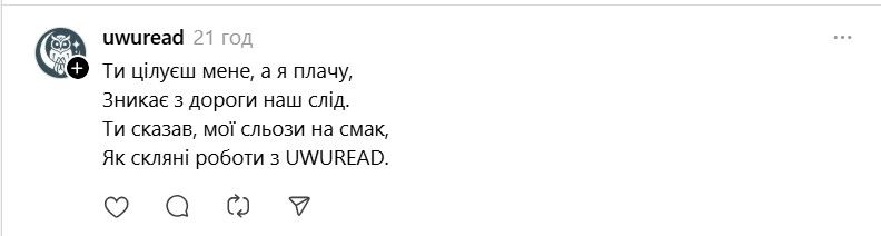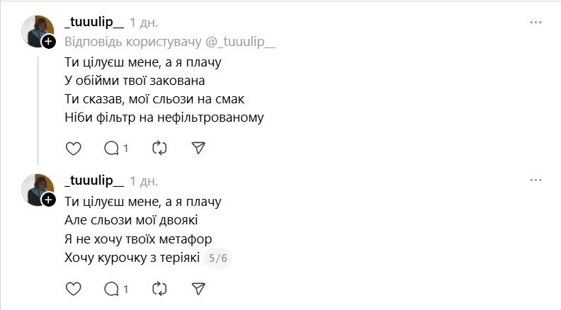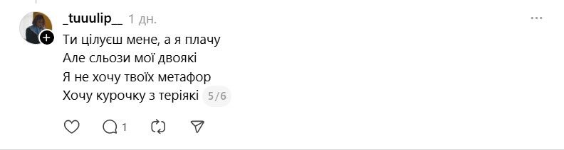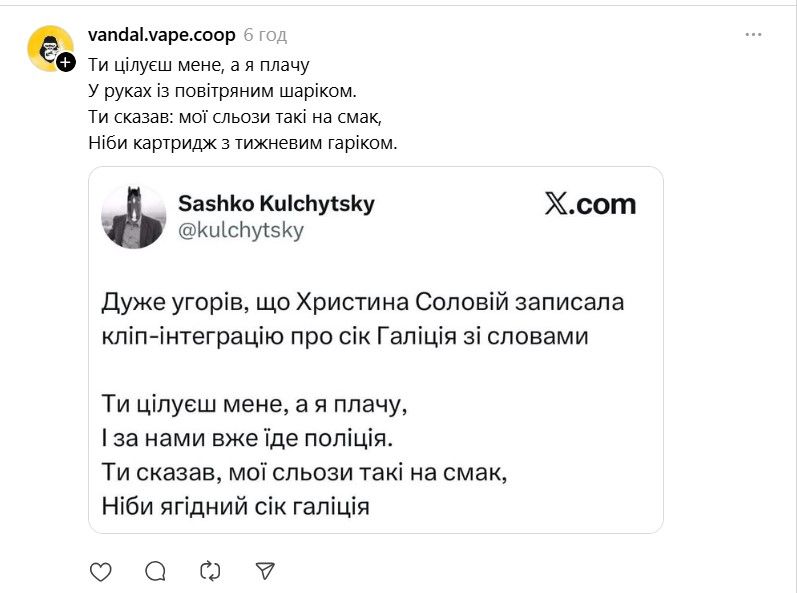 Ще одна кумедна ситуація відбулася в соцмережі Х, де Христина Соловій опублікувала допис, порівнявши свою нову пісню з хітом Лани Дель Рей. Допис прокоментував нібито її колишній – Сергій Жадан, що неабияк розбурхало мережу та стало ще одним приводом для жартів. Хоча насправді Сергій Жадан не є користувачем соцмережі Х. Вочевидь, хтось вирішив таким чином пожартувати.