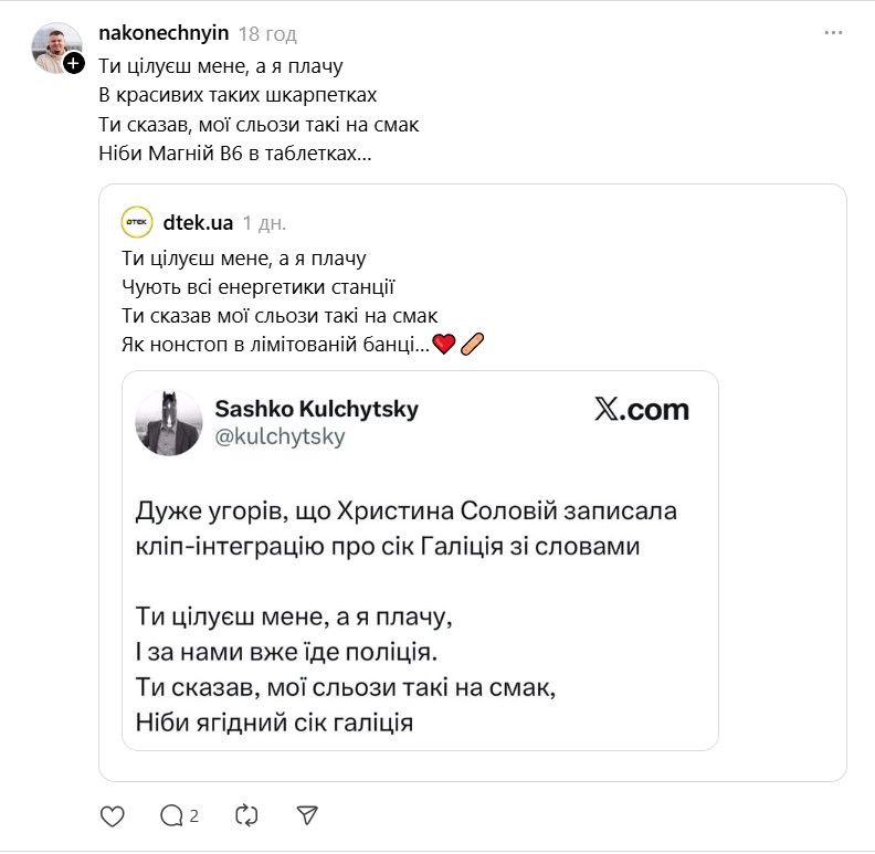 І це стало приводом для жартів, бо українці почали своєрідне змагання у креативності, яке з'явилося не без участі відомих українських брендів. Наприклад, ДТЕК замість березового соку вирішив порівнювати смак сліз з енергетиком та оливою в трансформаторі, а Укрпошта – з доставкою в коробці від "Нової пошти".