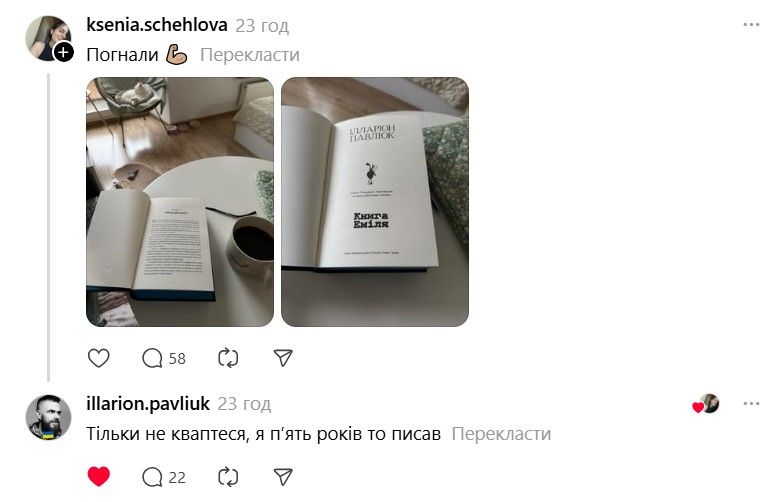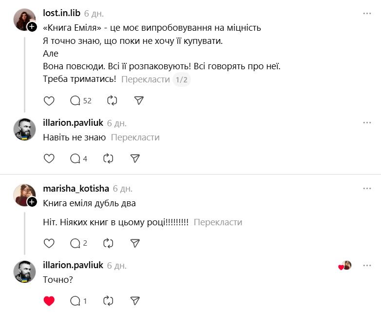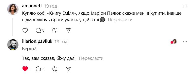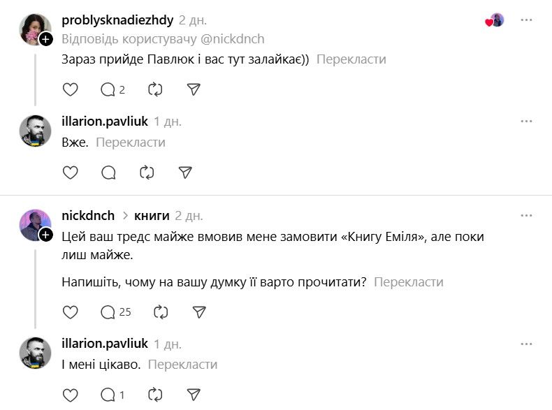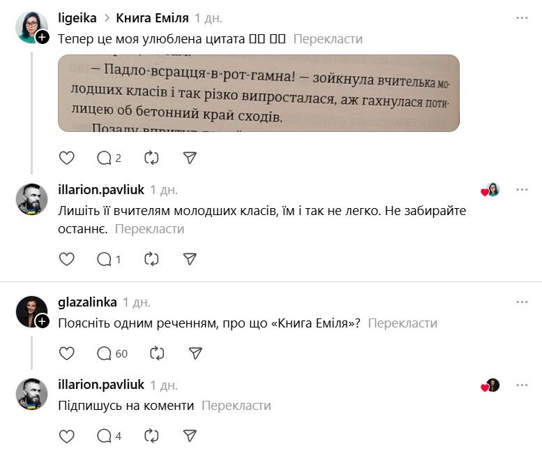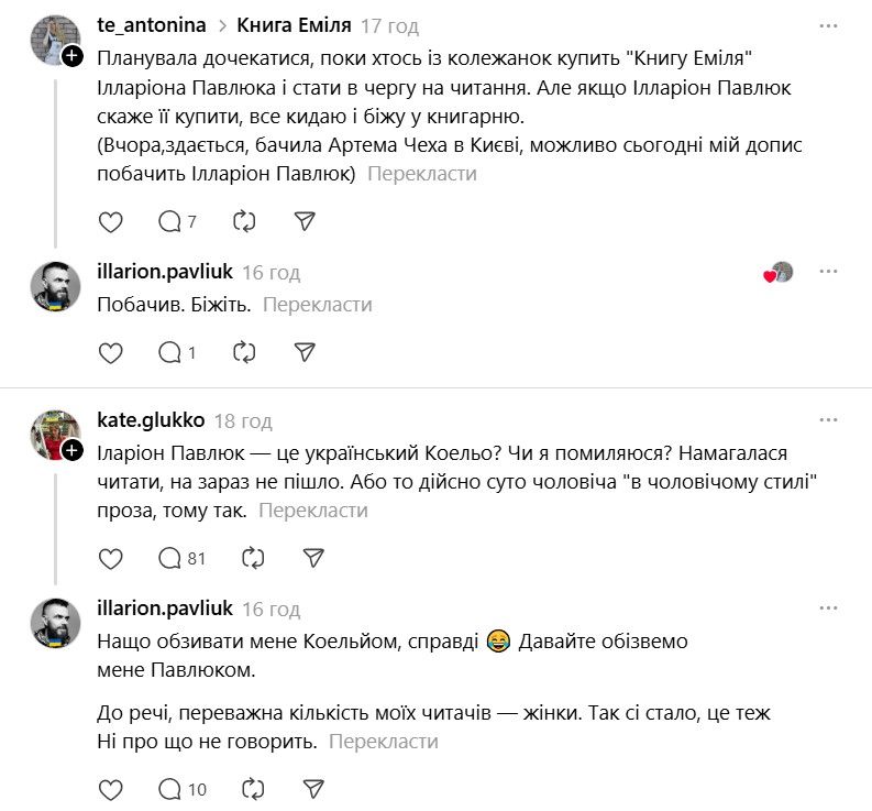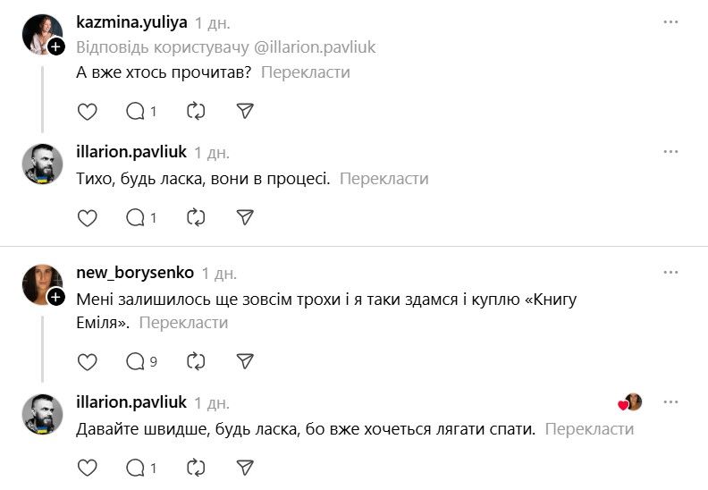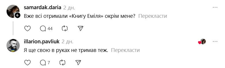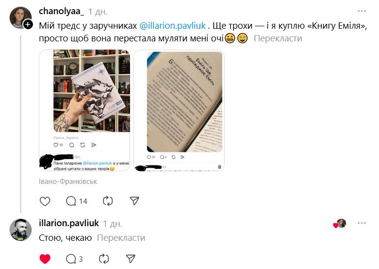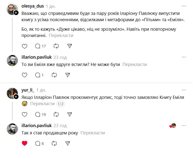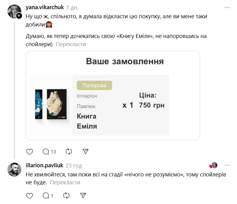 І ось тепер у Threads з'явилася хвиля дописів про те, що якщо Павлюк прокоментує допис, то вони таки придбають "Книгу Еміля". В одному з коментарів письменник пожартував, що саме так він став продавцем року.