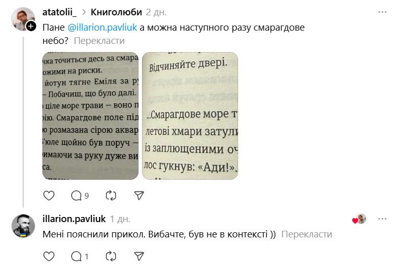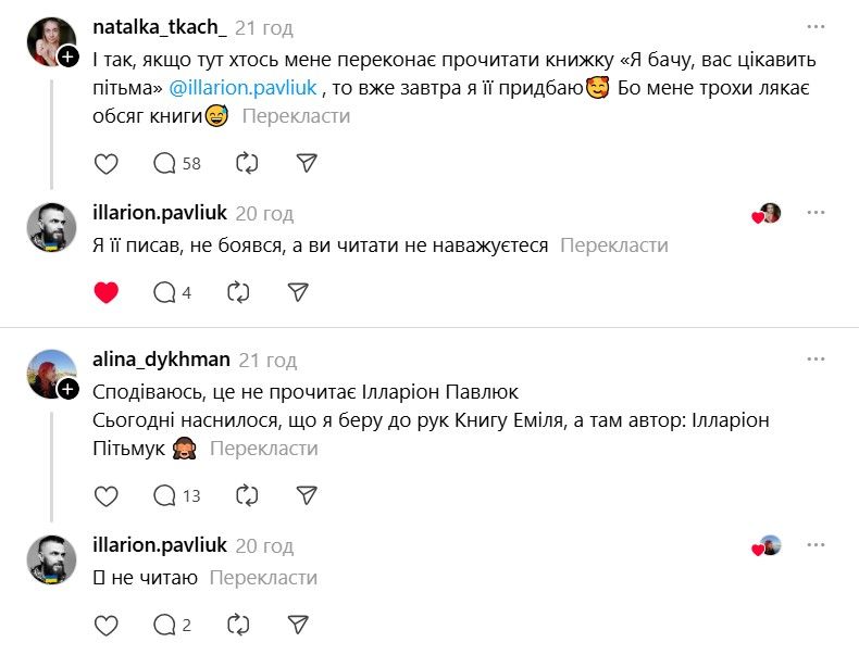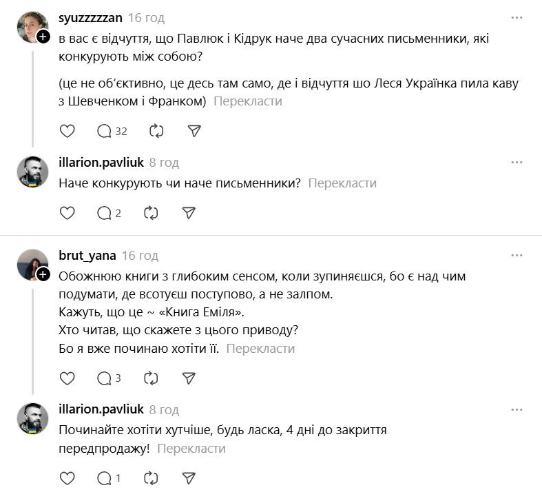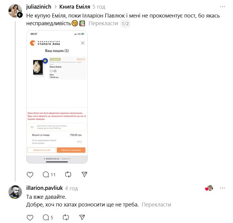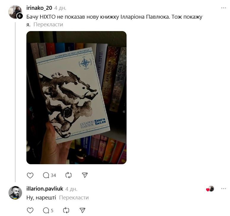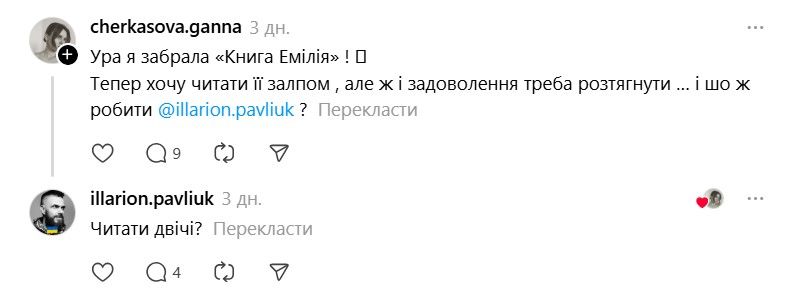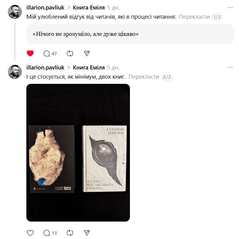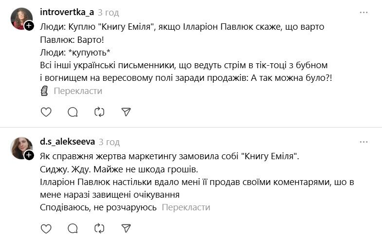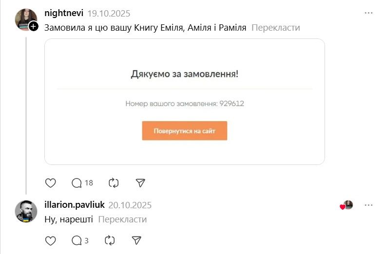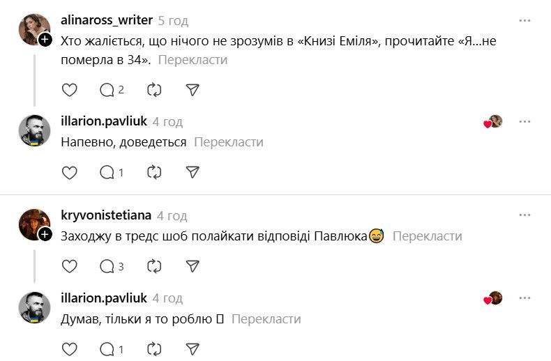 І ось тепер у Threads з'явилася хвиля дописів про те, що якщо Павлюк прокоментує допис, то вони таки придбають "Книгу Еміля". В одному з коментарів письменник пожартував, що саме так він став продавцем року.
