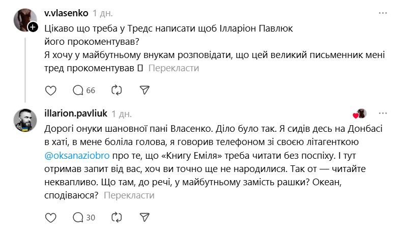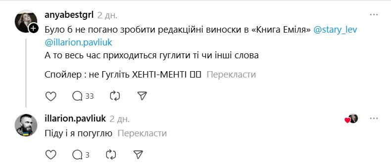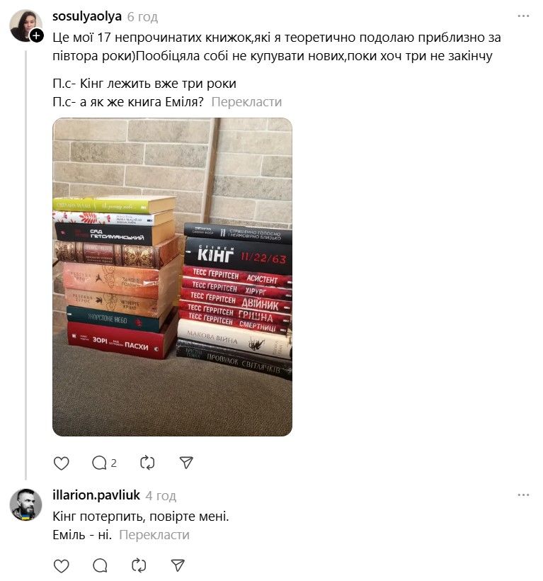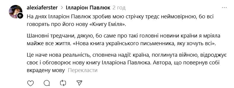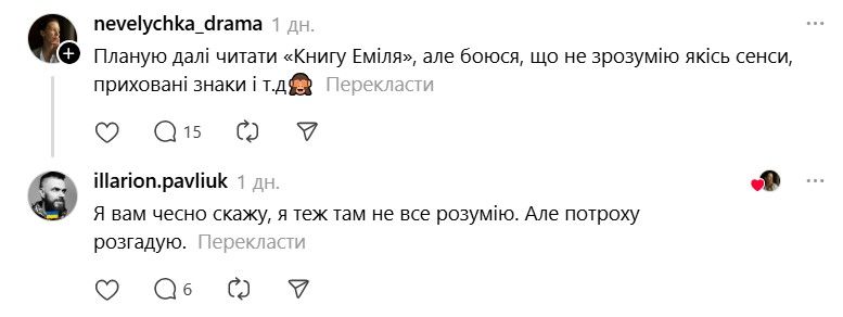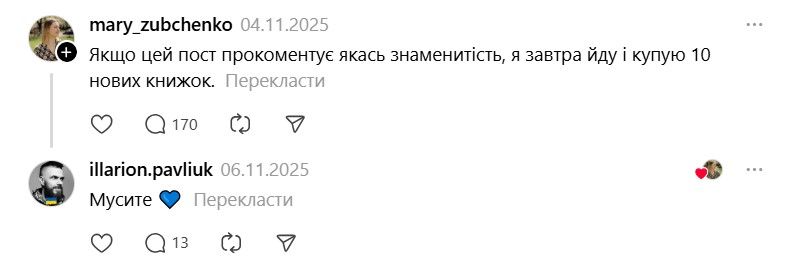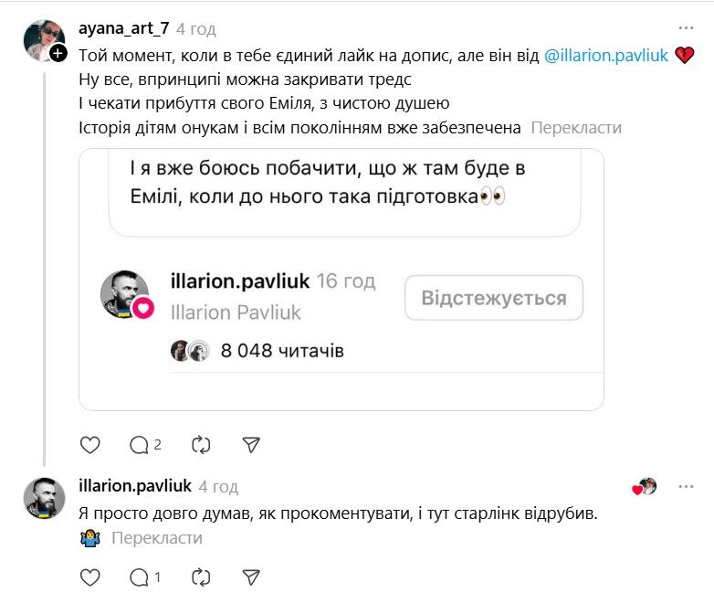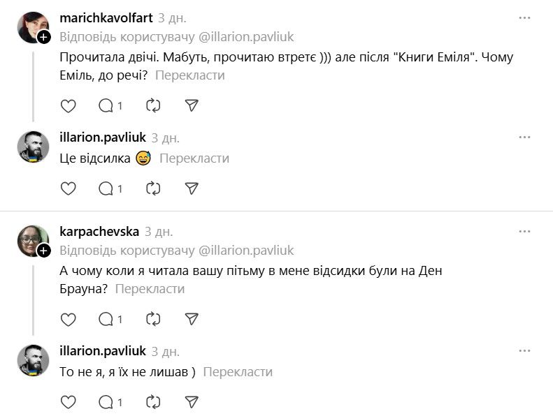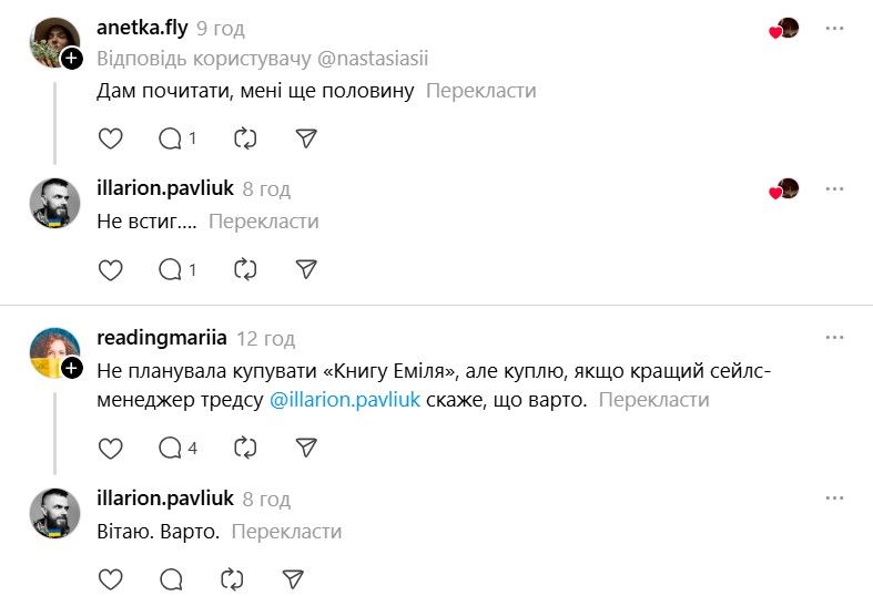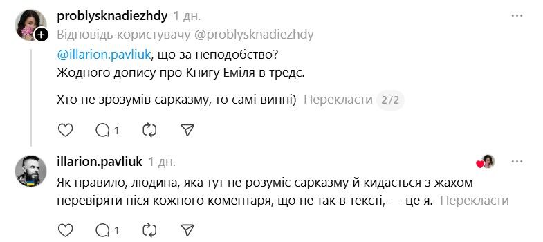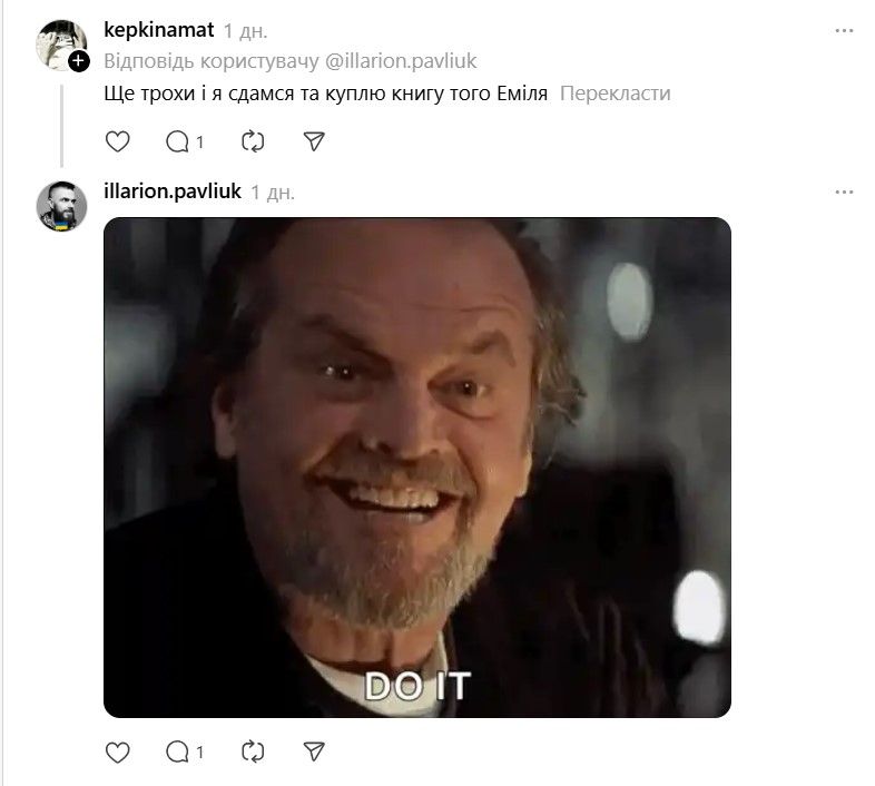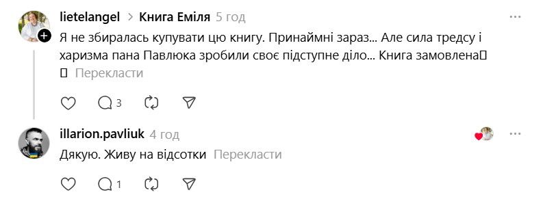І ось тепер у Threads з'явилася хвиля дописів про те, що якщо Павлюк прокоментує допис, то вони таки придбають "Книгу Еміля". В одному з коментарів письменник пожартував, що саме так він став продавцем року.