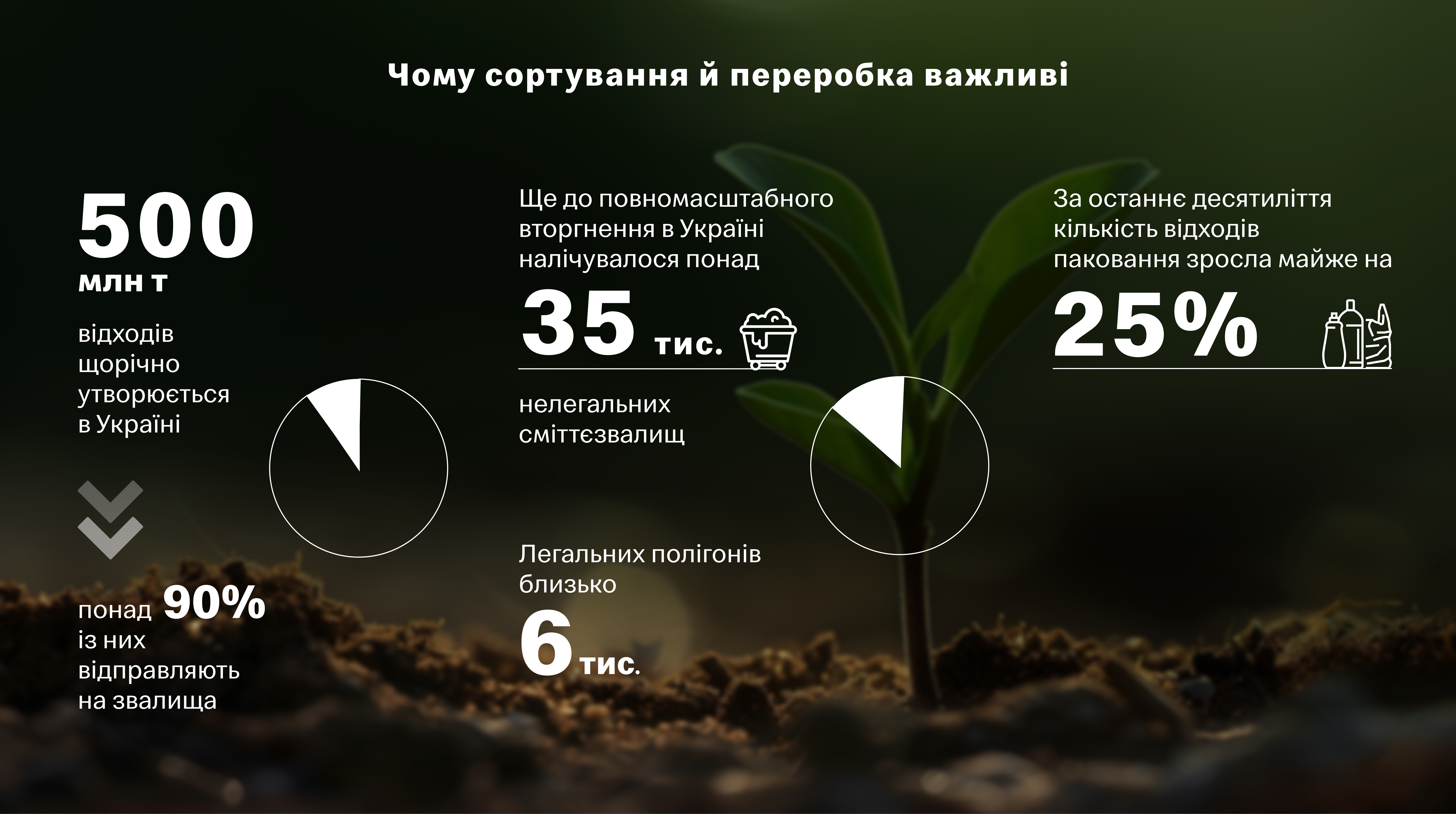На жаль, проблема забруднення довкілля дуже актуальна й для України. Щороку на території нашої держави утворюється близько 500 мільйонів тонн відходів. Понад 90% з них просто відправляють на сміттєзвалища. До 2022 року статистика була такою: