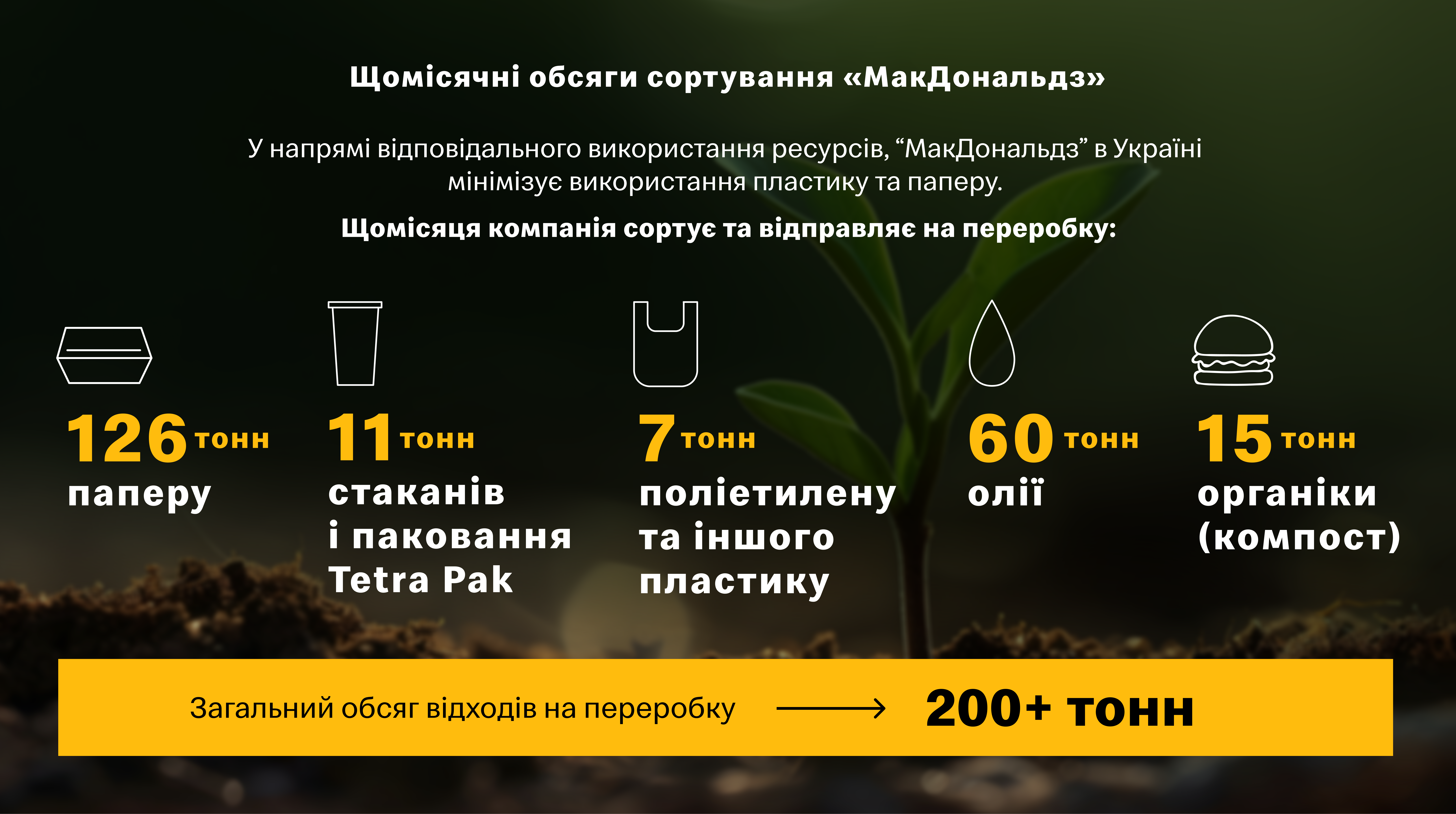 Станом на 2024 рік "МакДональдз" в Україні щомісяця сортує та віддає на переробку понад 200 тонн відходів. Зокрема, мовиться про: