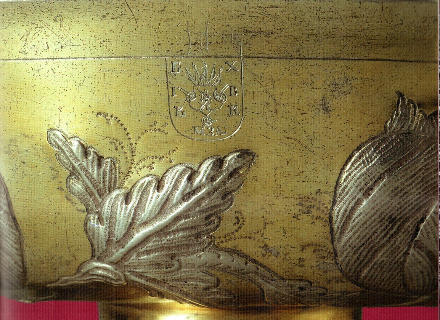 Фрагмент чаші водосвятної з гербом Війська Запорозького та ініціалами Хмельницького / З книги "Гетьманські клейноди" Савчука
