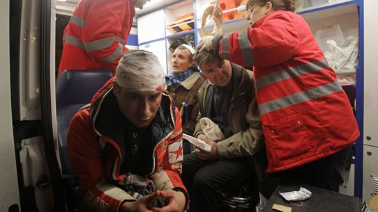 Медики надають допомогу постраждалим мітингувальникам / Фото Сергія Чузакова, ЦАМ