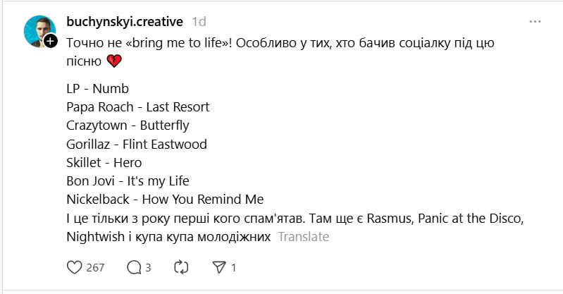 Автор поста предложил два варианта возможного "гимна". В частности, он считает, что песнями, которые характеризуют миллениалов являются Linkin Park – "In the End" или Evanescence – "Bring me to life". Эти песни действительно стали культовыми для того поколения.