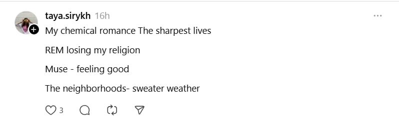 В то же время сообщение стало достаточно популярным. По состоянию на 25 сентября 2025 года там более 57 тысяч просмотров. Пользователи предложили свои варианты того, что можно считать "гимном миллениалов".