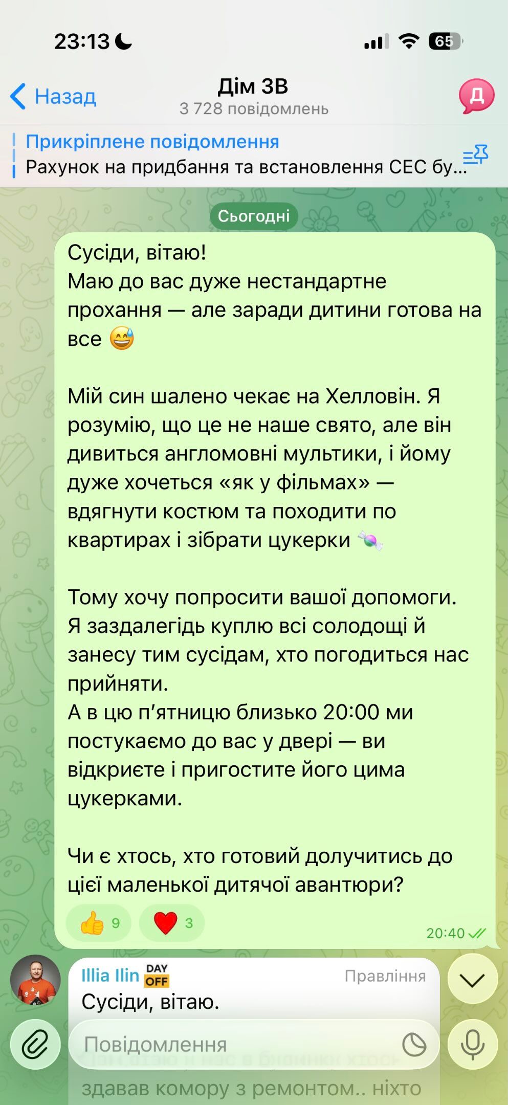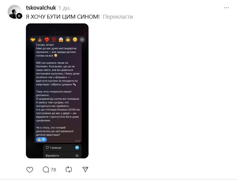 В соцсети Threads Анна поделилась скриншотом сообщения, которое написала в чат дома своим соседям. Она назвала свою просьбу странной, однако подчеркнула, что она готова на все ради сына, а он с нетерпением ждет Хэллоуин. Анна говорит, что понимает, что этот праздник является для нас чужим, но все же увидев в американских мультфильмах, как дети ходят от дома к дому и их угощают конфетами, тоже хочет так отпраздновать.