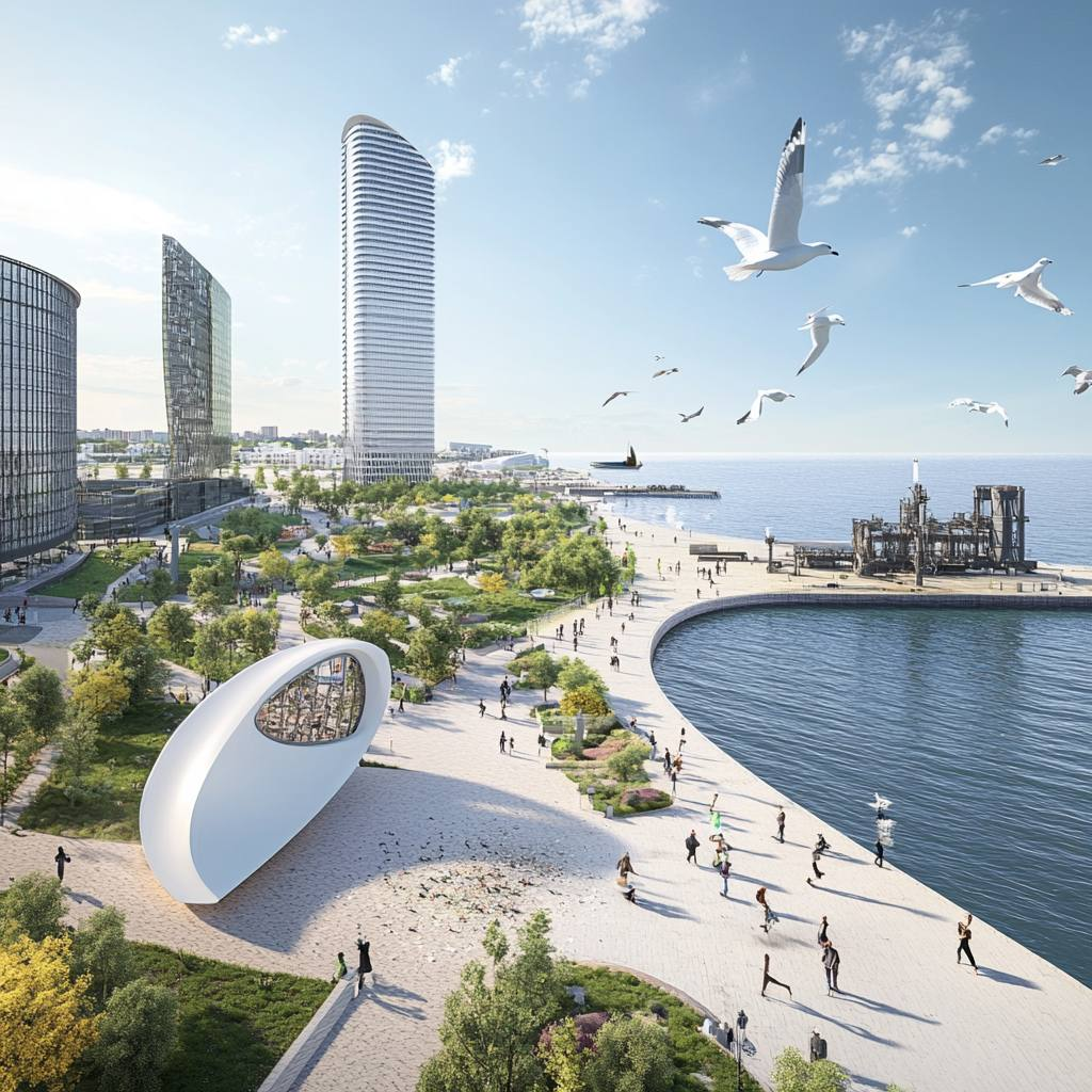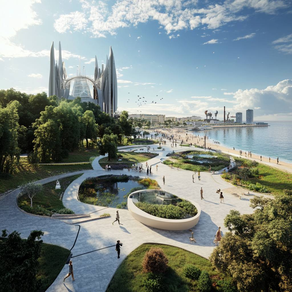 Восстановленный после разрушений, Мариуполь выглядит как зеленый, инновационный город, где экологические решения гармонично сосуществуют с современной архитектурой,