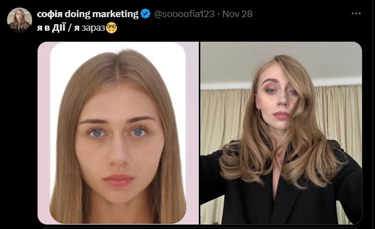 Однако из пользовательниц платформы Х 28 ноября поделилась, что не может пройти верификацию в приложении Дия, а позже опубликовала еще одно сообщение, где показала, как выглядит ее фото в приложении и как она выглядит сейчас. На первый взгляд – два совершенно разных человека. Поэтому она предложила всем пользователям показать сравнение вида на документах в приложении и в реальной жизни.