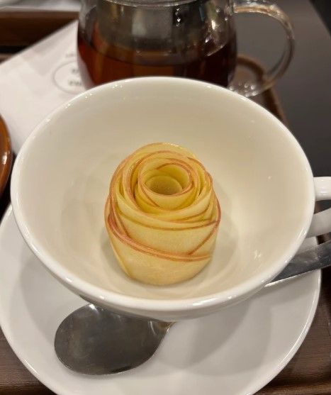 В центре японской столицы, в городе Токио, есть заведение Oyopee Coffee, где подают необычный чай. При заказе вам приносят чашку, в которой выложена роза из яблока. Ее надо залить горячим чаем и тогда "цветок расцветает".