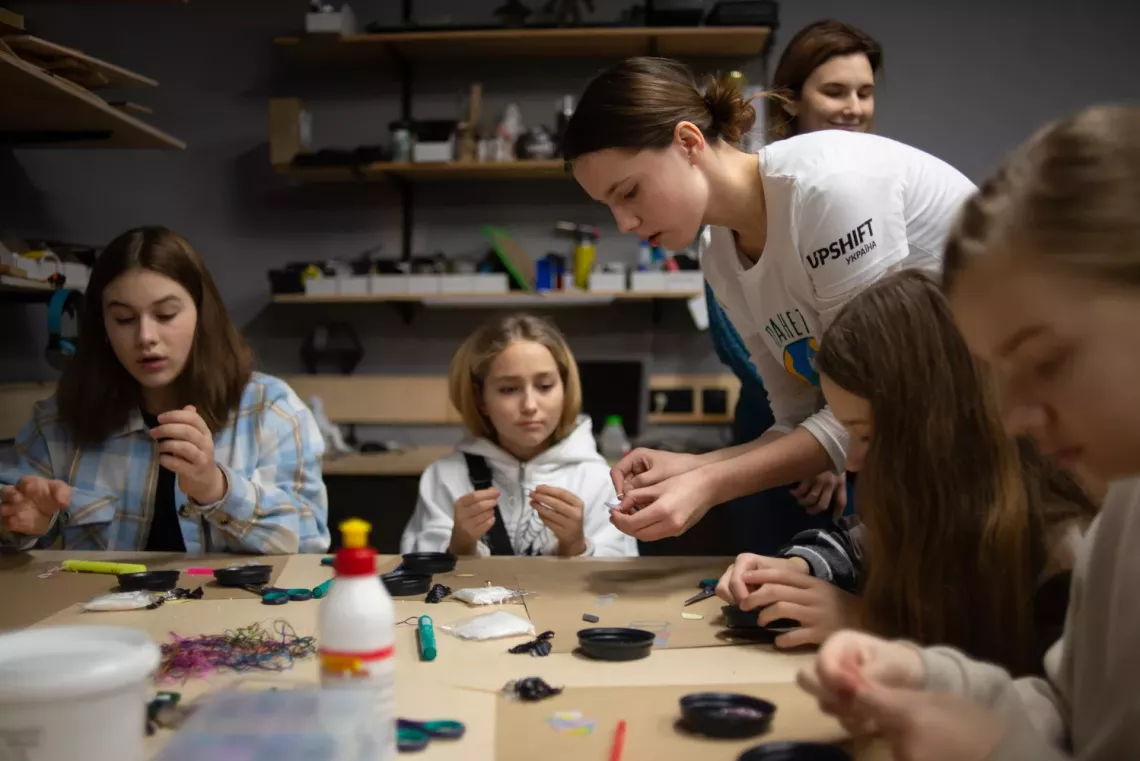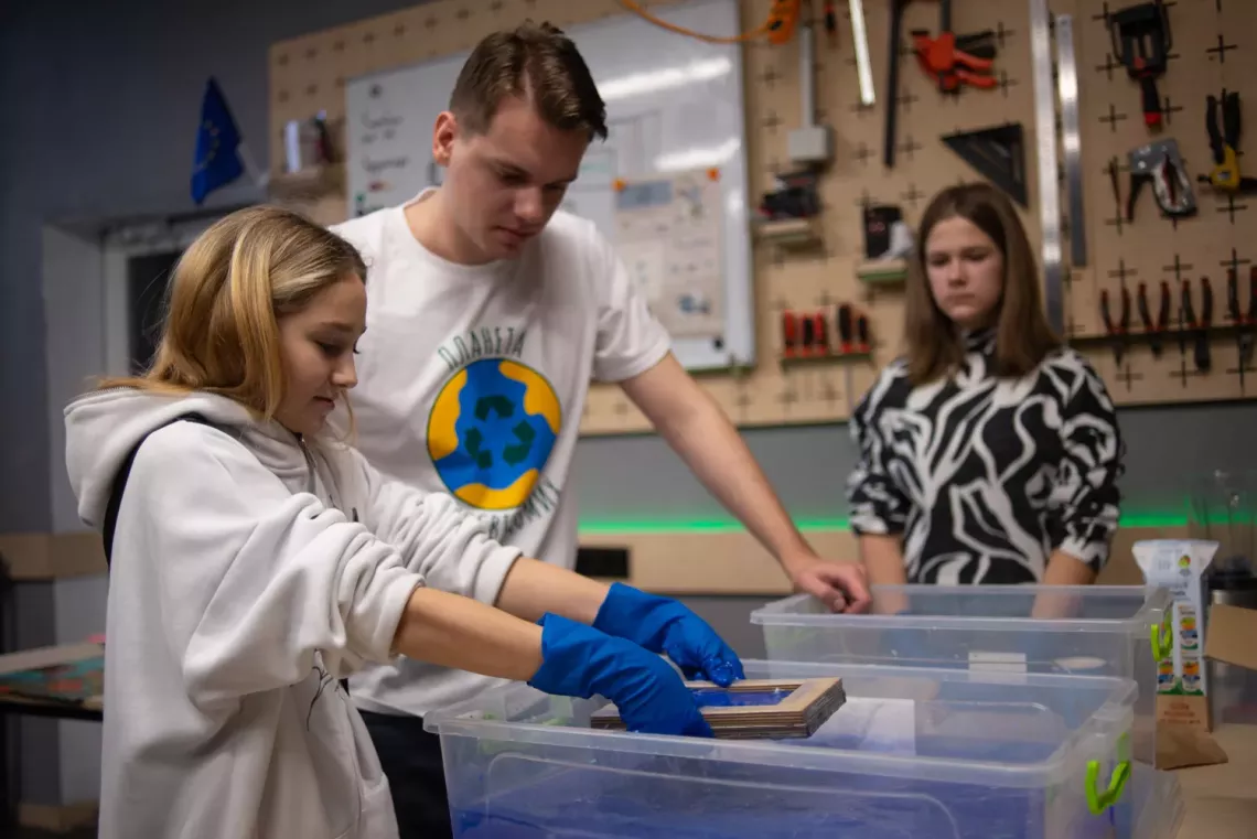 - последнюю станцию расположили в мастерской Марии-Елизаветы, где апшифтерка рассказывала детям, как правильно сортировать отходы, и какие материалы поддаются повторному использованию. Также девушка демонстрировала свои инструменты для переработки пластика. Так, вместе со школьниками Мария-Елизавета сделала из крышек от бутылок стаканчики для хранения канцелярских принадлежностей.