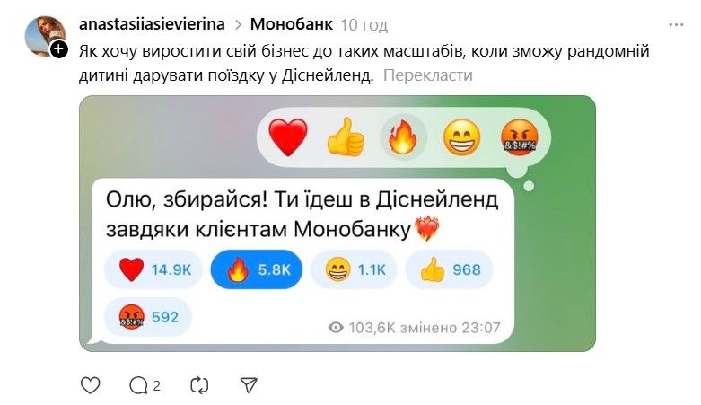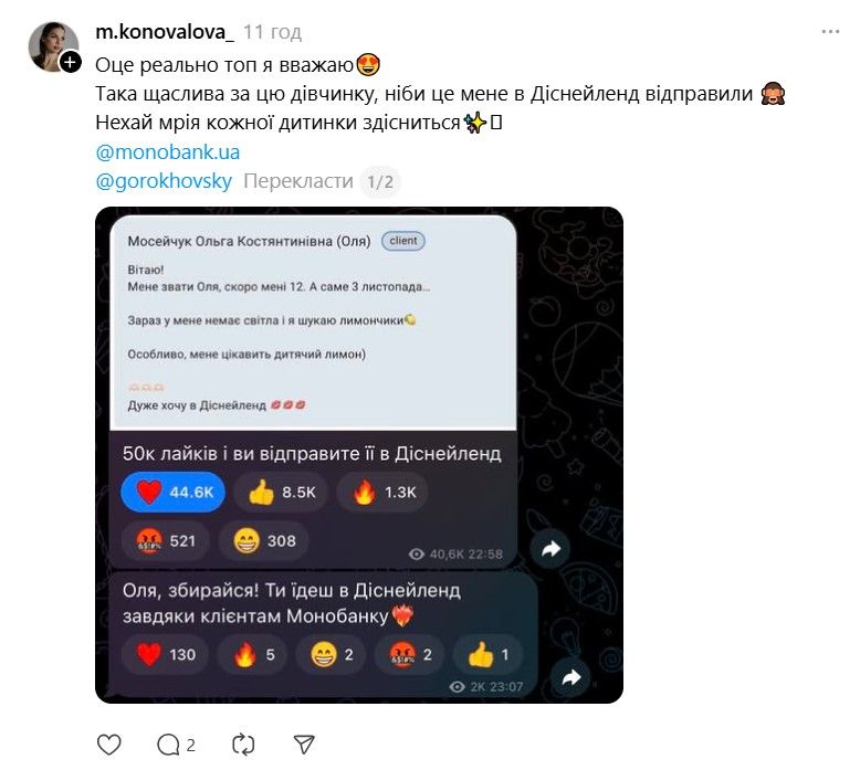 Олег Гороховский опубликовал историю у себя на канале и добавил, что если сообщение соберет 50 тысяч лайков, то monobank подарит пользовательнице путевку в Диснейленд.