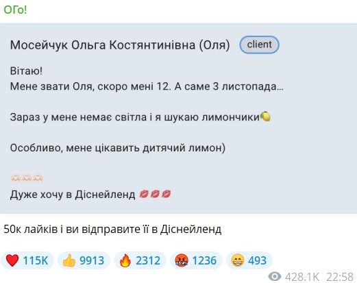 Соучредитель monobank опубликовал обращение маленькой клиентки Оли, которой 3 ноября исполнится 12 лет. Она поделилась, что сейчас у нее дома нет света и она проводит время за поиском лимонов. А причина отсутствия света – российские атаки, из-за которых по регионам начали вводить аварийные отключения. Девочка сказала, что мечтает выиграть путевку в Диснейленд, поэтому пытается найти 51 лимон.