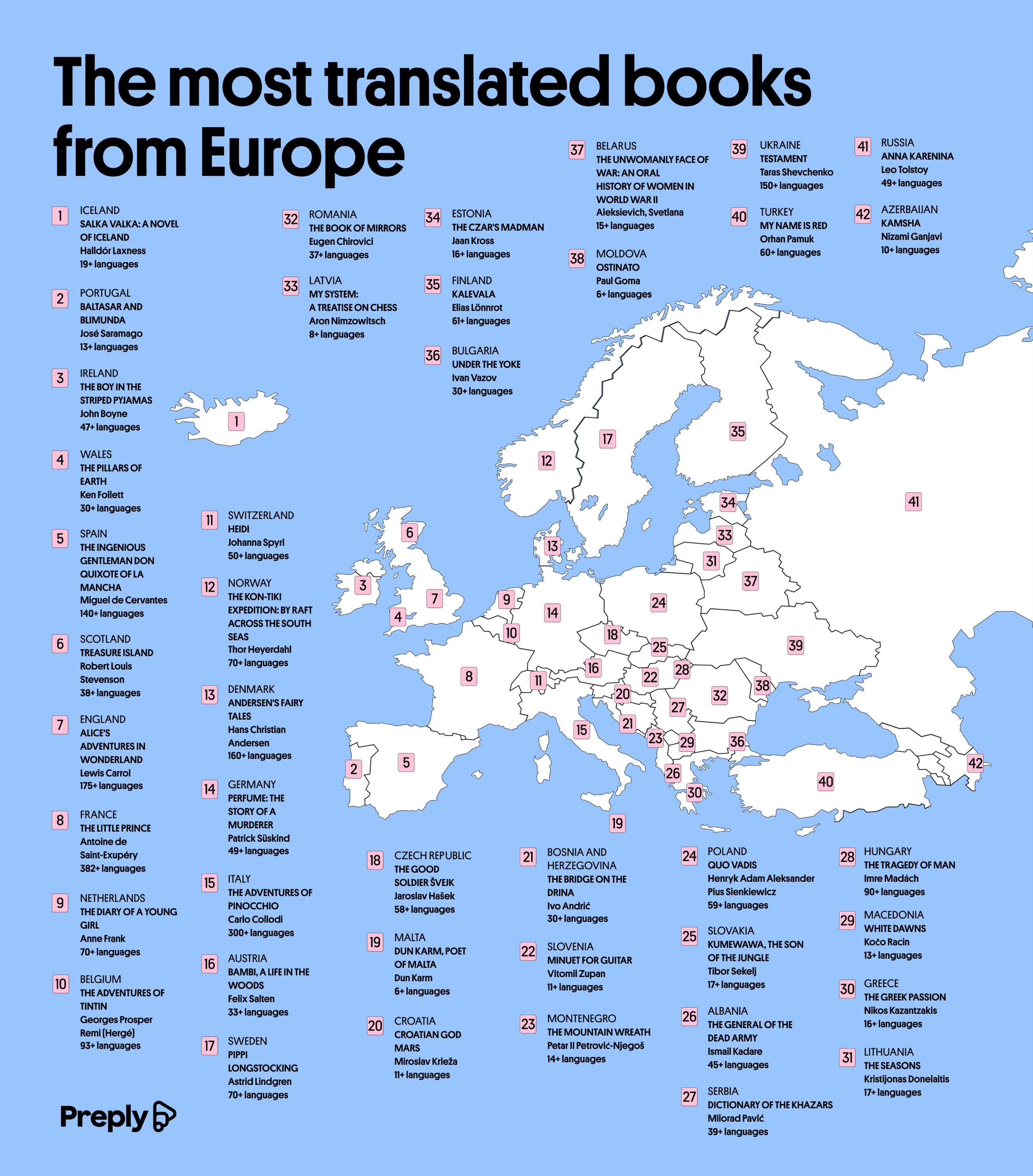 Например, абсолютным лидером по количеству переводов в мире после Библии является повесть "Маленький принц" французского писателя Антуана де-Сента Эзюпери – произведение переведено аж на 382 языка мира. Среди других лидеров: