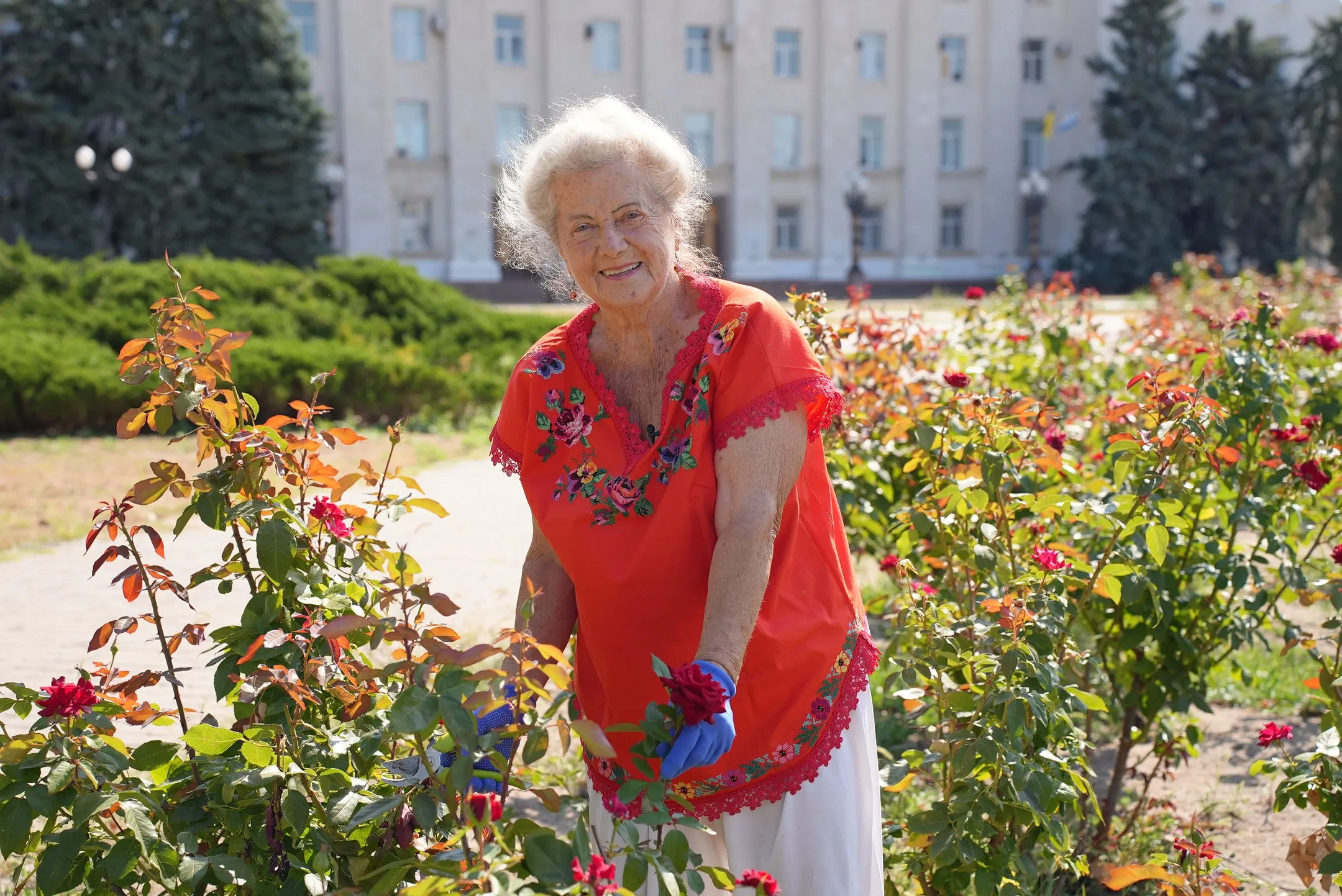 Женщина собственноручно подрезает кусты роз, чтобы продлить их цветение и дать возможность появиться новым побегам. По ее словам, этот труд приносит ей настоящее удовольствие.