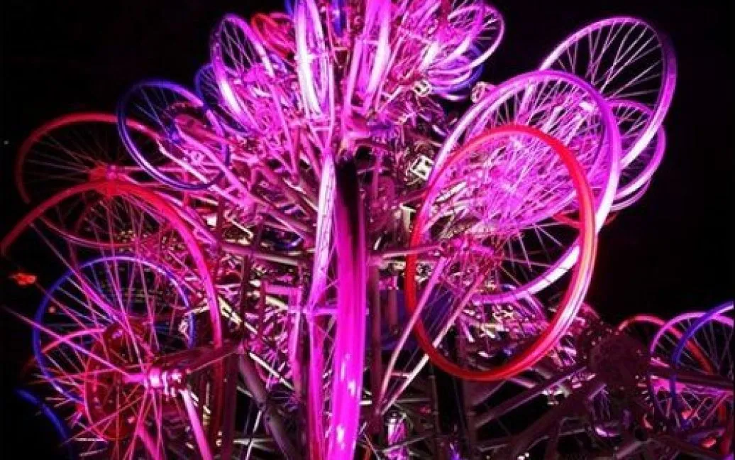 Чтобы придать инсталляции праздничный вид, рамы велосипедов покрасили в зеленый цвет, а колеса украсили различными цветами, превратив их в яркие украшения, привлекающие внимание. Этот инновационный проект не только подчеркивает праздничный дух, но и способствует повышению экологического сознания в обществе.