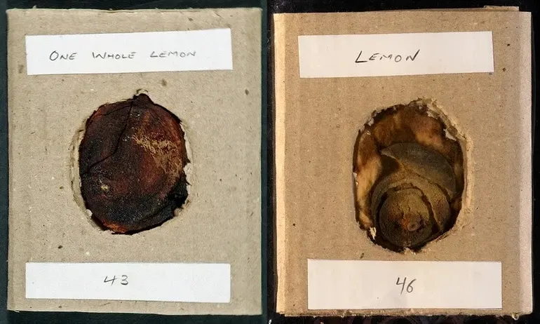 Слева – найденный в кармане Мюллера лимон, а справа – кусочки лимонов, найденные в ящике / Фото National Archives