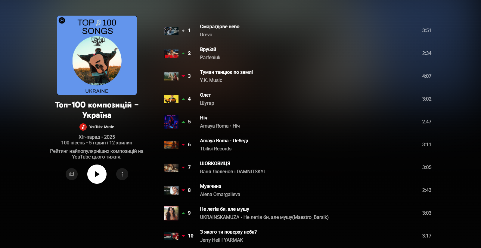 На YouTube Music ситуація дещо інша, але знайомі імена лишилися в лідерах. Другу позицію тут зайняв Parfeniuk з "Врубай", а на третю несподівано вийшла Y.K. Music із треком "Туман танцює по землі". Дивовижним тут є те, що цю пісню згенерував штучний інтелект. Однак навіть попри цей факт слухачі її досить високо оцінили.