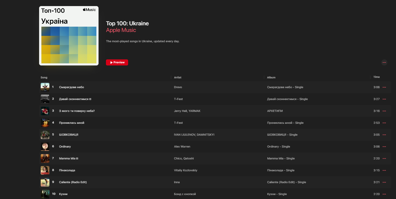 Безперечним лідером за прослуховуваннями в Apple Music також є "Смарагдове небо" у виконанні DREVO. Далі йде T-Fest із російськомовними піснями "Давай сконектимся" та "Прониклась мной" (2 і 4 місця відповідно).