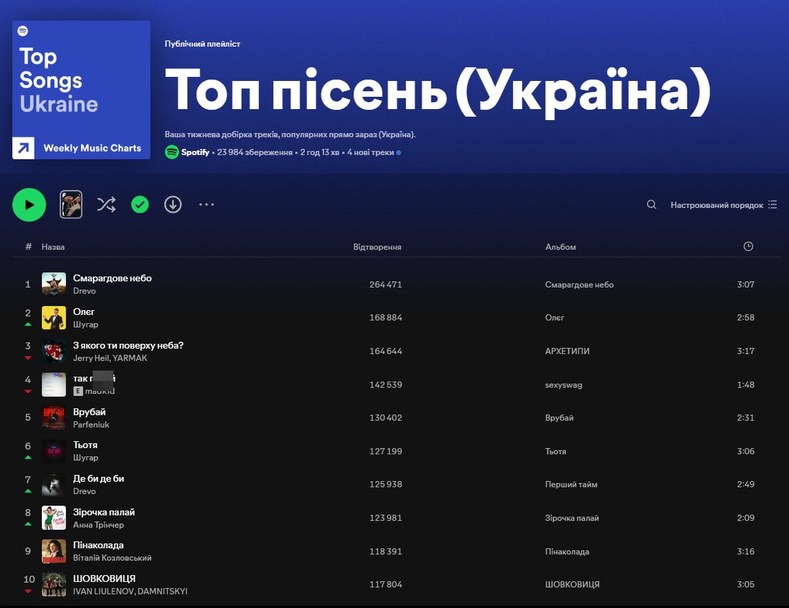- На Spotify у топ-5 також увійшли Шугар з піснею "Олег", дует Jerry Heil і YARMAK, і Parfeniuk з піснею "Врубай".