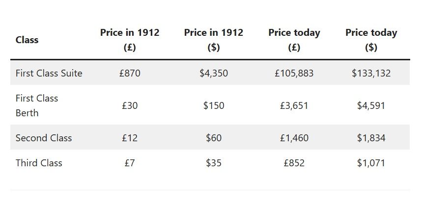 Квитки на "Титанік" у 1912 році коштували від 7 до 870 фунтів стерлінгів. За сьогоднішніми цінами це дорівнює приблизно 850 фунтів стерлінгів за третій клас і понад 105 000 фунтів стерлінгів за найкращі каюти першого класу.