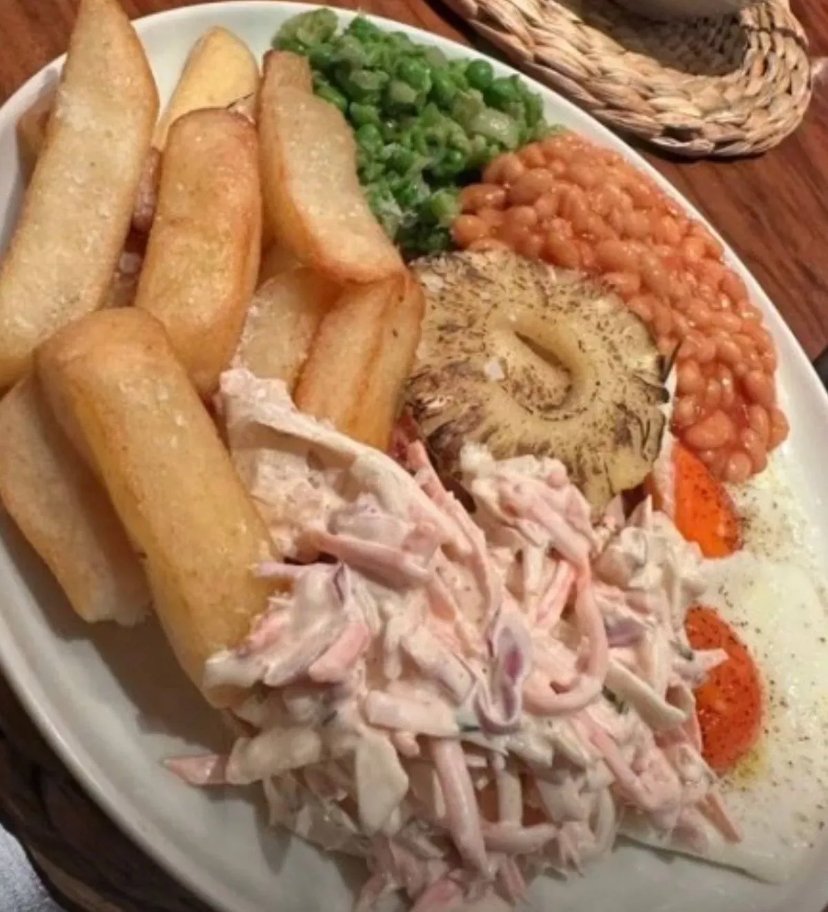 Вчорашня вечеря – одна з моїх улюблених страв з дитинства. Дякую, мамо. Шинка, картопля фрі, смажене яйце, консервований ананас, горох і печена квасоля, капустяний салат,
