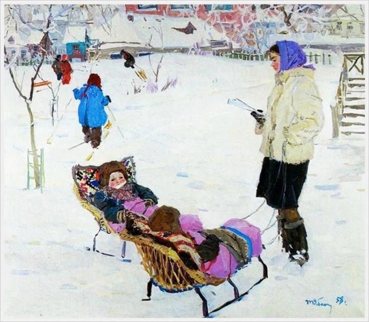 Також у Тетяни Яблонської є картина "Близнюки" 1958 року, яка передає звичні будні того часу. Матір тепло одягнула своїх дітей, закутавши в коцики й відправилася з ними на двох санчатах на прогулянку.