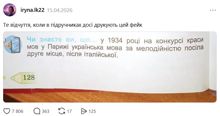 Водночас цей міф досі живе у публічному просторі: користувачі Threads поділилися прикладами зі шкільних підручників, де й нині можна натрапити на згадки про неіснуючий "конкурс у Парижі" та вигадане місце української мови.