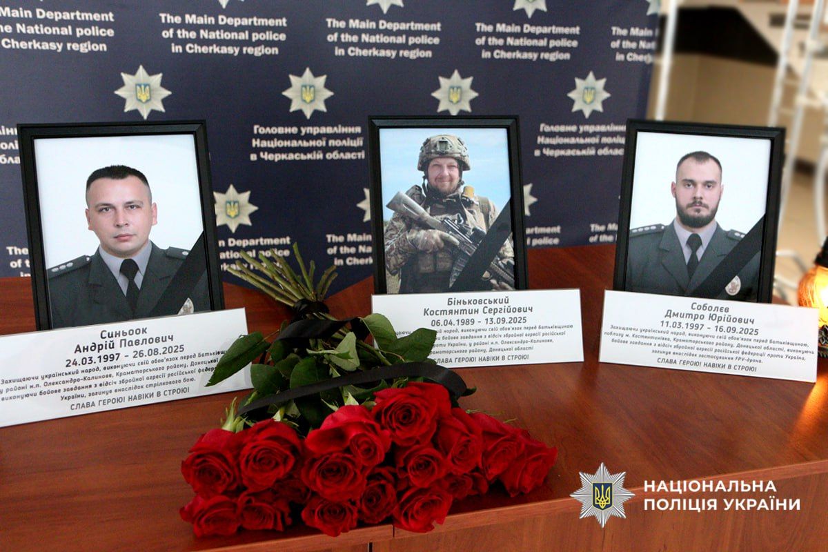 За даними Нацполіції, нещодавно у Черкаській області останньою дорогою провели старшого лейтенанта поліції Андрія Синьоока, капітана поліції Костянтина Біньковського, а також капітана поліції Дмитра Соболєва.