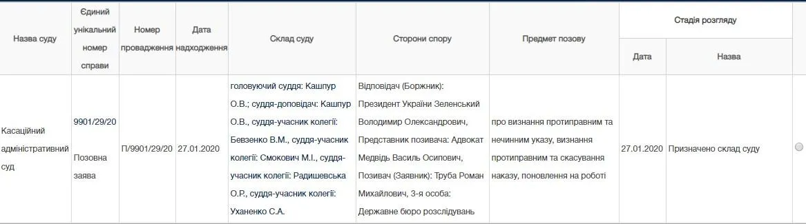 Позов Труби проти Зеленського розглядатиме Касаційний адміністративний суд. У справі вже призначено склад суду з п’яти суддів. Головуючим визначено суддю Ольгу Кашпур.