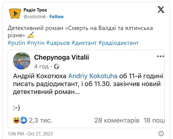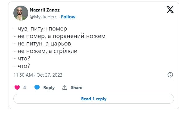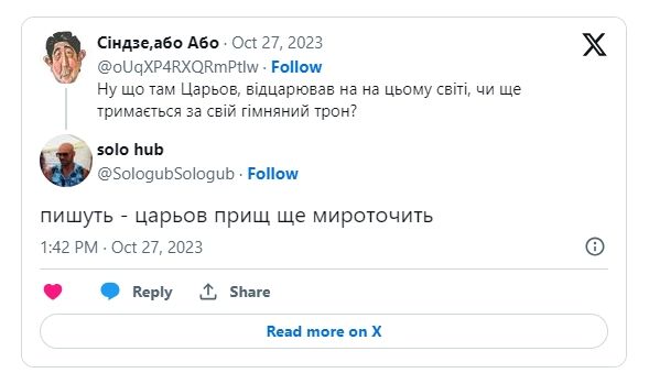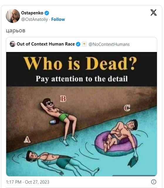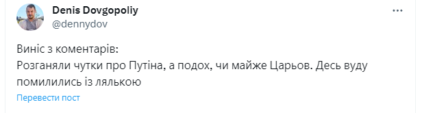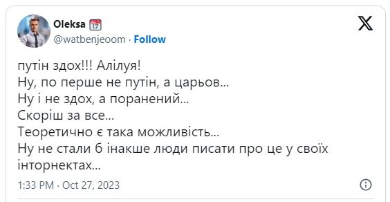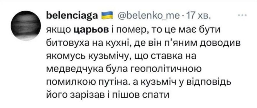 Протягом останніх кількох днів у мережі активно ширяться чутки про нібито "смерть Путіна". Українці також активно коментували такий вкид і жартували з цього приводу. Пригадуючи факт про буцімто "смерть" російського президента, користувачі мережі жартують, що, можливо, ліквідувати хотіли "царя", але щось переплутали й під ударом опинився Царьов.