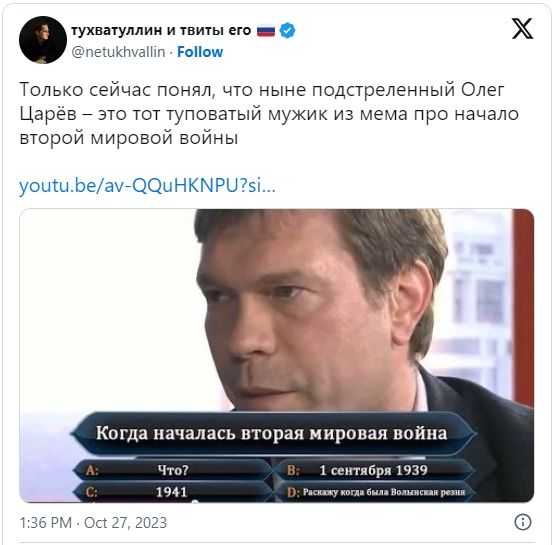 Царьов став героєм мемів після того, як не зміг відповісти на питання "Коли почалася Друга світова війна". Після повідомлень про "напад" на зрадника мережа вибухнула новими мемами. Як реагують на "поранення" Царьова у мережі – передає 24 Канал.