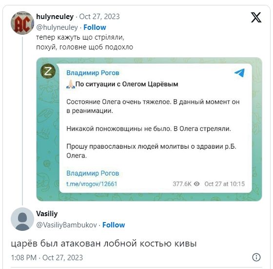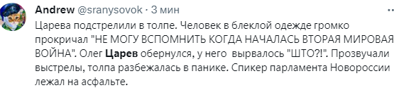 Жартують українці й з приводу того, як нібито "скоїли замах" на Царьова, адже російські пропагандисти повідомляли різну інформацію щодо цього. У мережі припускають, що сталася просто "побутова сварка".