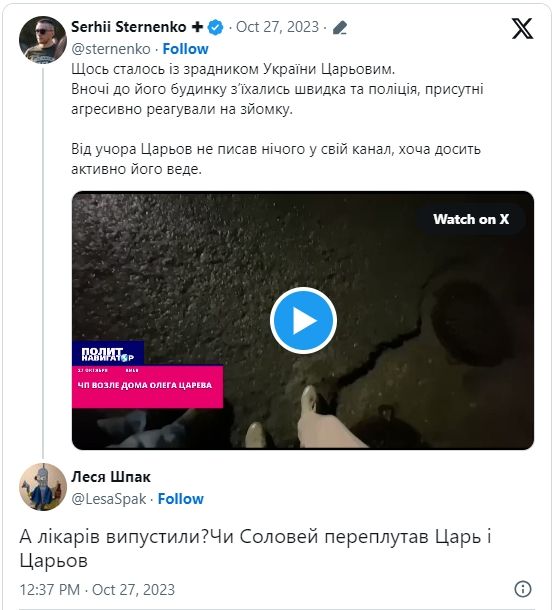 - Російські телеграм-канали почали повідомляти, що на зрадника України Олега Царьова нібито скоїли "замах". Біля його будинку в Криму вночі бачили багато поліцейських та карети швидкої.