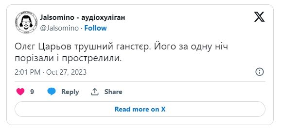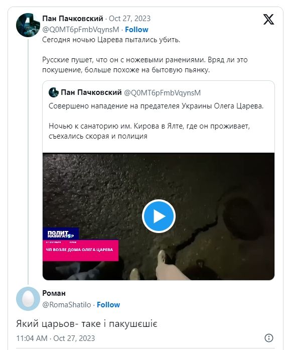 - У мережі спочатку повідомили, що Царьова нібито "підрізали" у власному будинку. Згодом з'явилася інформація, що колаборант нібито отримав вогнепальне поранення.