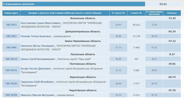 На окрузі №23 у Волинській області опрацьовано 72,3% протоколів. Тут шанс стати депутатом має Ірина Констанкевивич від УКРОПу (53,93% голосів). Вона випереджає свого переслідувача на 39%.