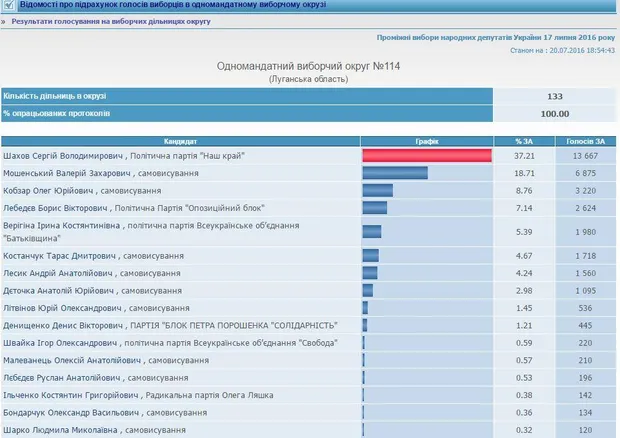 Слід зазначити, що явка виборців на ОВО №117 стала найбільшою на довиборах до Верховної Ради та становила понад 63% виборців. Саме ж підрахунок голосів на Луганщині сильно затягувався.