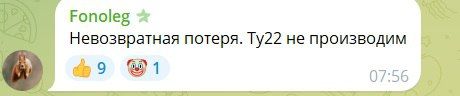Однак більшість все ж визнає "безповоротну втрату". Росіяни бідкаються, що літаки Ту-22М3 більше не можуть виготовляти, критикують міноборони Росії, що вони не визнають втрати, а заявляють про "несправність".